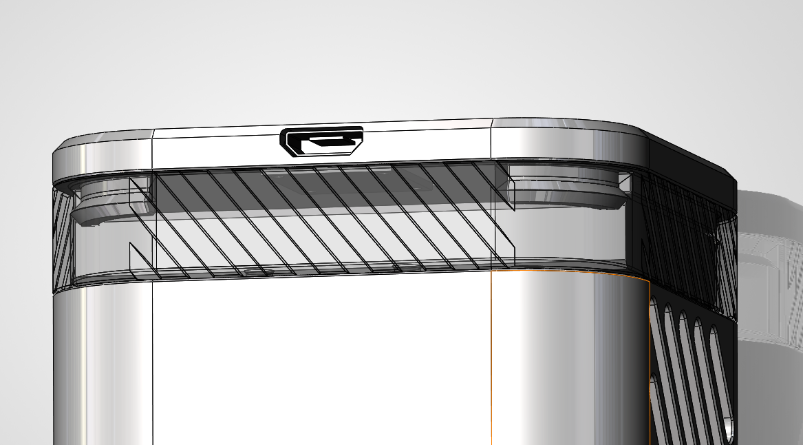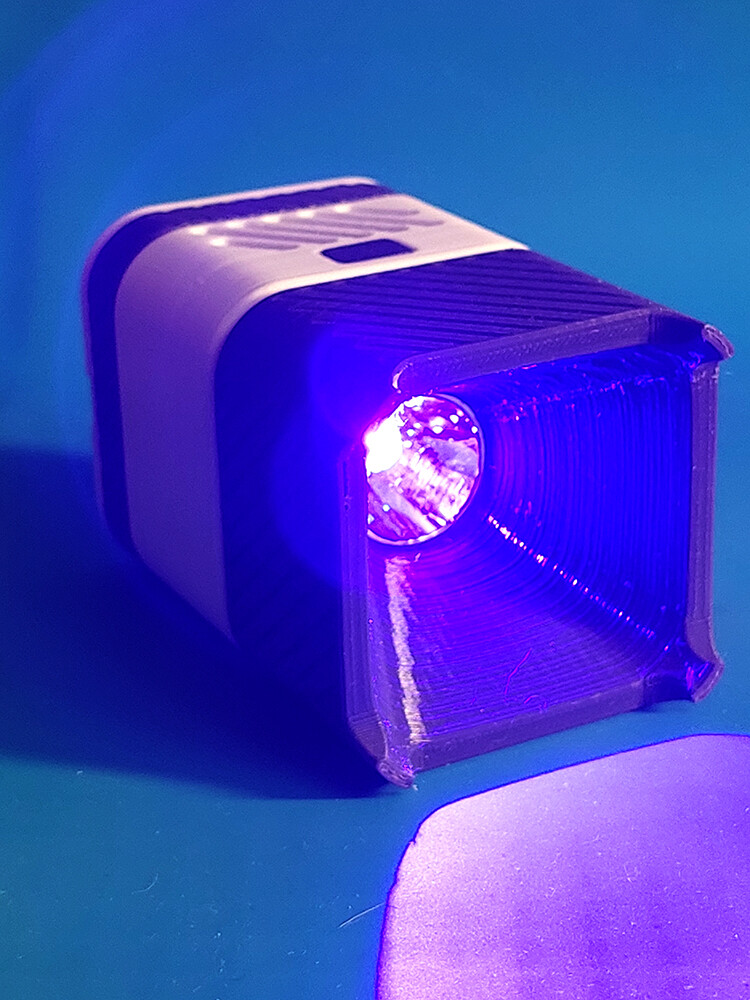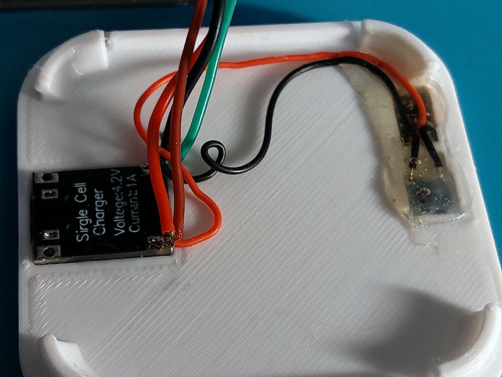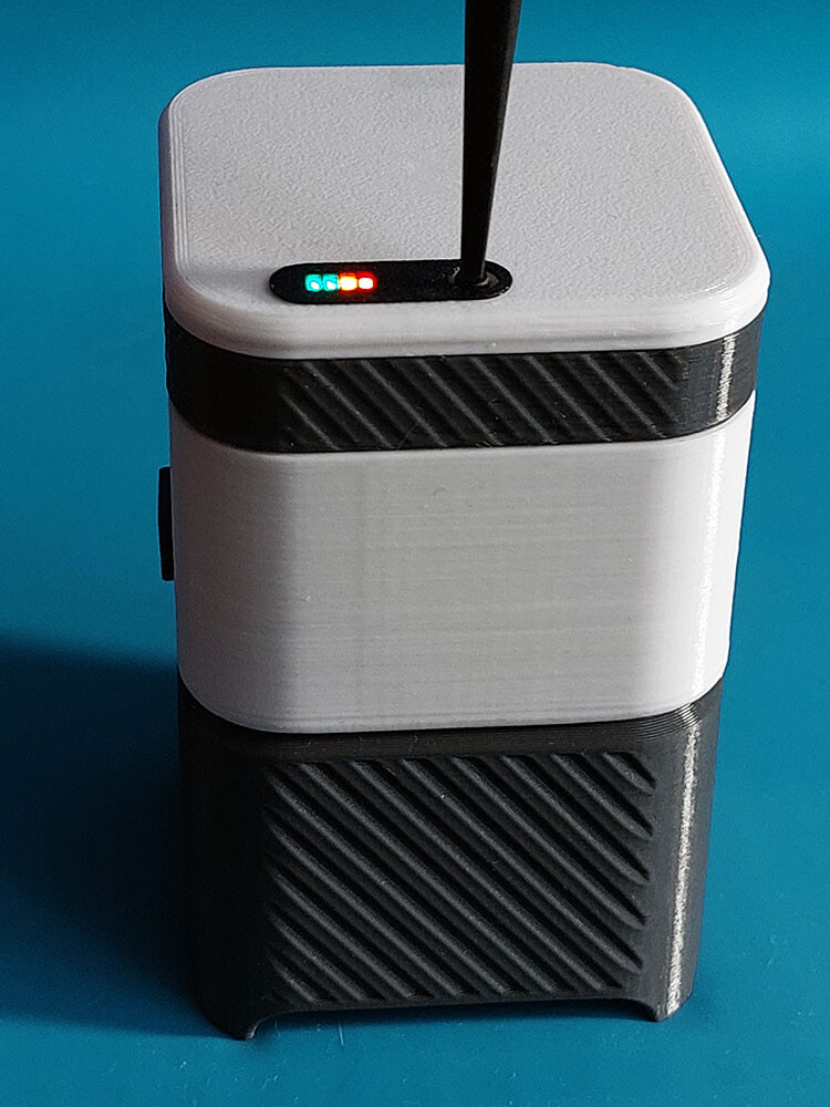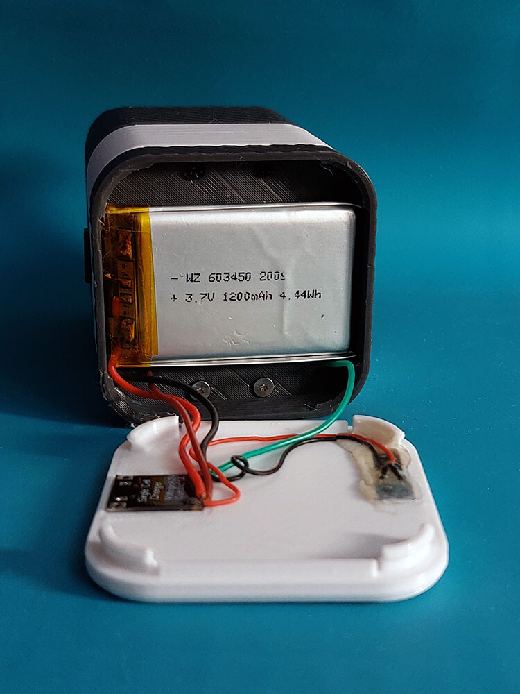 Для печати был выбран пластик Petg, двух цветов, особых настроек для печати не требовалось, всё печаталось соплом 0,4мм без использования поддержек, с высотой слоя 0,24мм. Изначально предполагалось что под светодиоды индикации не будут делаться отверстия, через белый пластик они и так хорошо просвечивают. И если индикация зарядки смотрелась вполне неплохо, там всего два светодиода, красный - идёт заряд и зелёный - зарядка завершена, то для индикатора уровня заряда, это выглядело не очень. Поэтому позже, в крышке над индикатором уровня заряда, было вырезано сквозное отверстие и допечатана накладка черного цвета, с пазами под каждый светодиод.