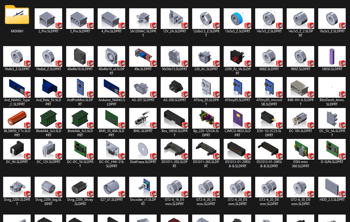 Как обычно, перед тем как начать моделировать, создаю модели деталей которые будут использованы в данном устройстве (если таковых нет в моей библиотеки). Честно говоря не люблю это делать, нудное это занятие, но делать это надо, т.к. чем точнее снимешь размеры детали, тем меньше будешь перепечатывать моделируемый объект. Меж тем библиотека деталей постепенно растёт, пополняясь новыми моделями.