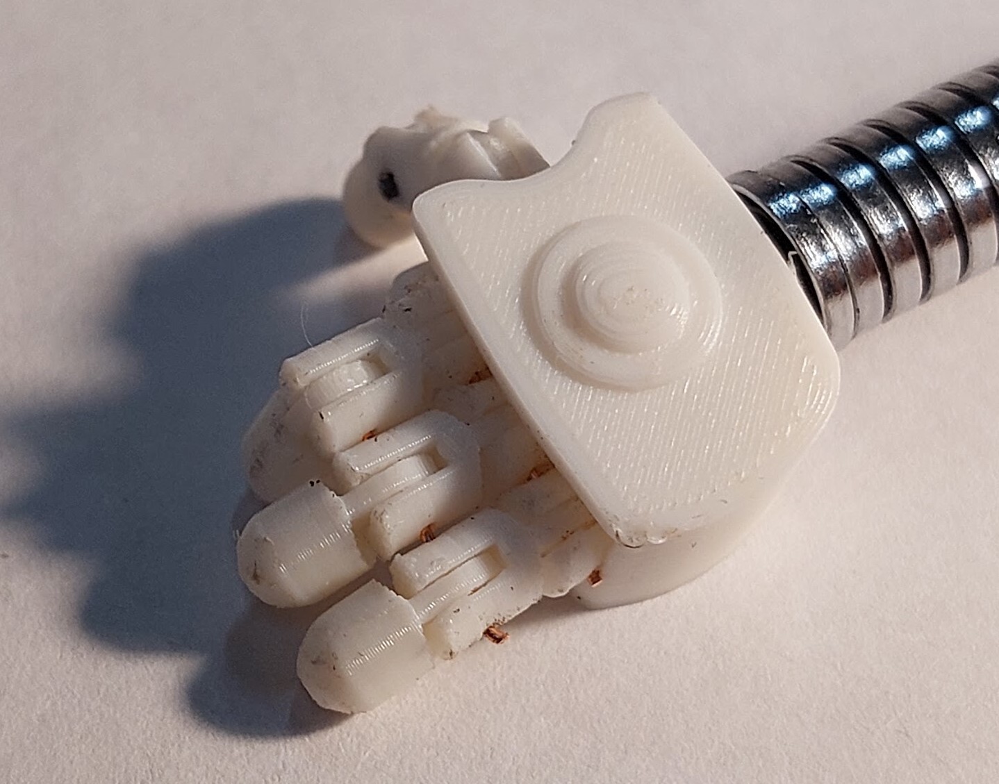 И всё равно видно на сколько грубо выглядит печать. Они еще будут обрабатываться и красится. Чтоб руки были подвижными, их сделали из гибкого металлического шланга от навесного светильника.