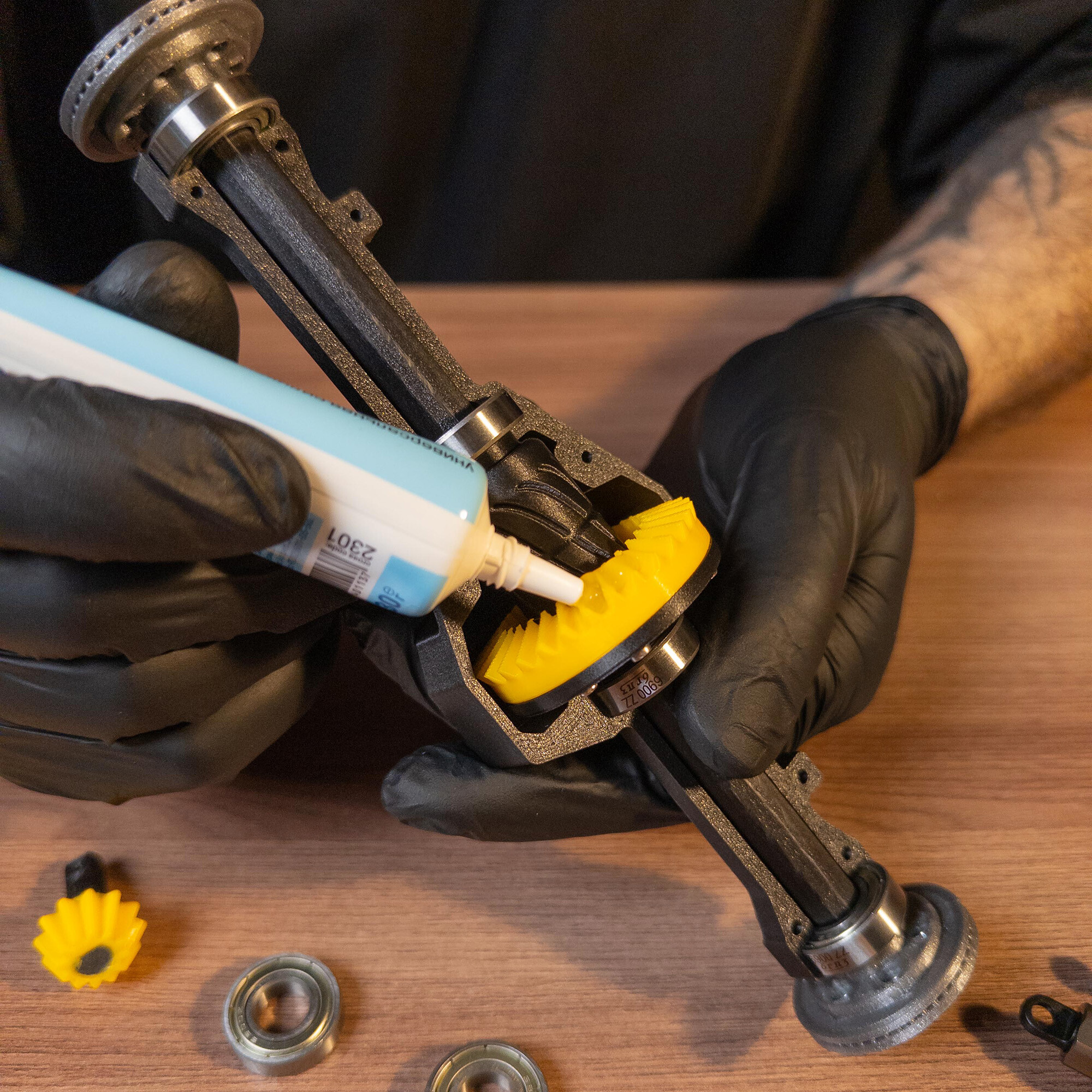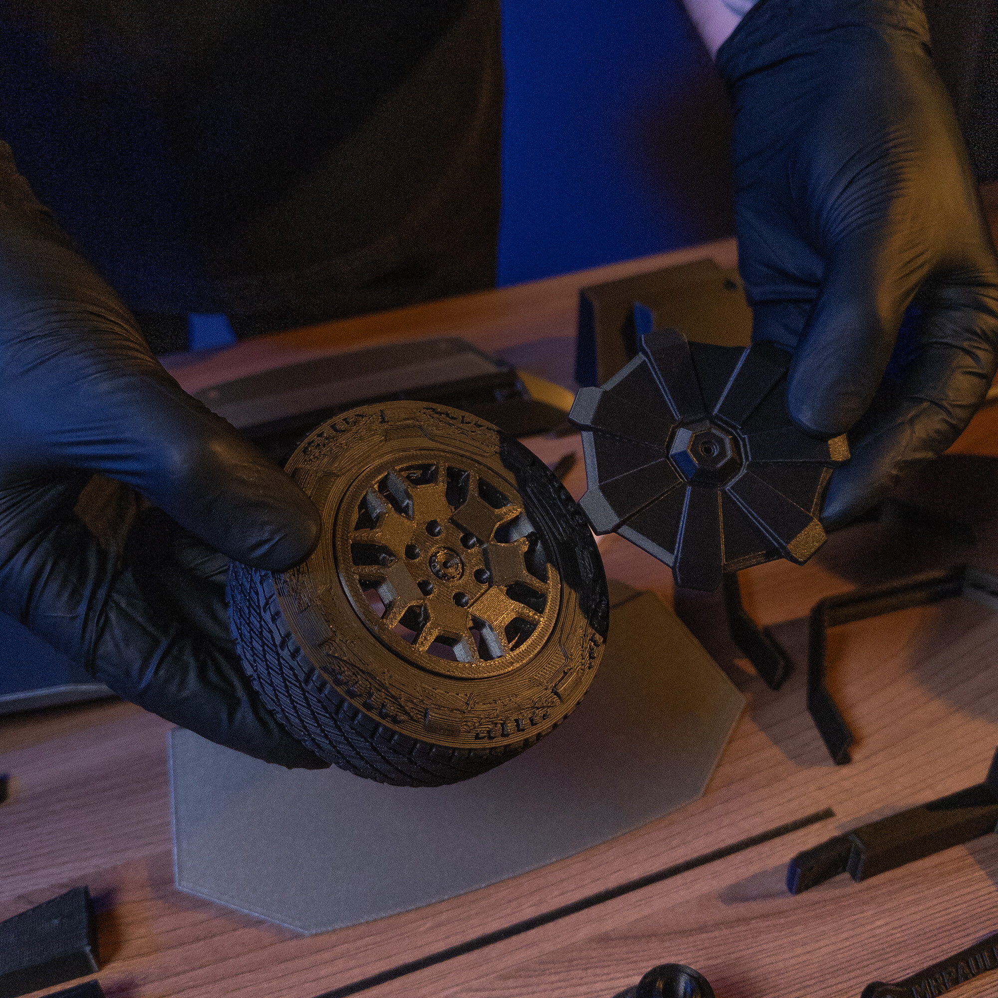 Для кузова Cybertruck я также смоделировал и распечатал стилизованные покрышки с дисками и колпаками. Перепробовал много гибких материалов для печати покрышек, но большинство из них давали слишком глянцевую поверхность и не были похожи на настоящую резину. В итоге остановился на BFgummy — капризном в печати, но очень приятном по тактильности и внешнему виду материале. Он даёт матовую фактуру, хорошо гнётся и визуально максимально близок к реальным шинам.