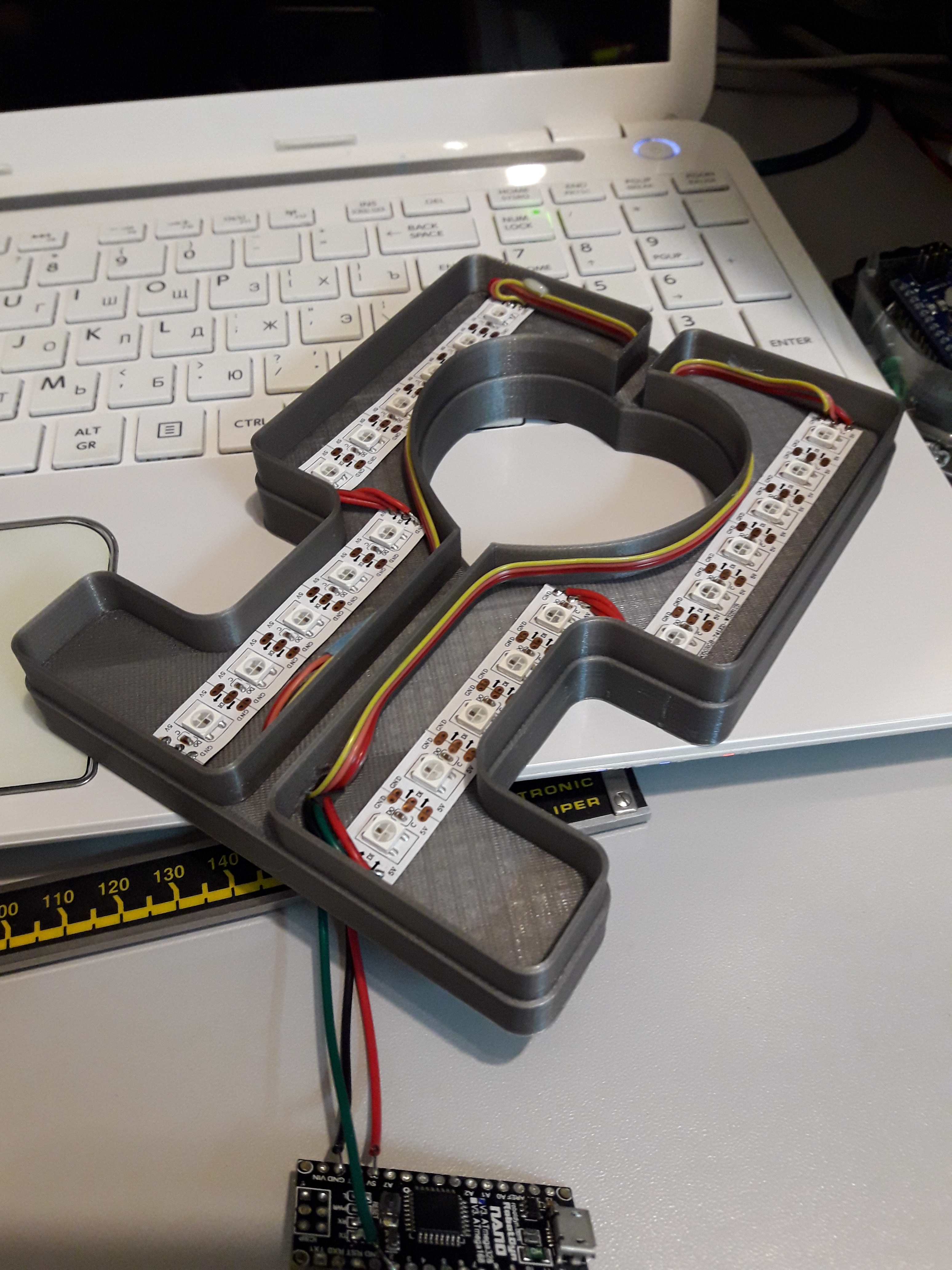 Коротенько напишу про свою поделку. У мамы с папой неожиданно подкатила 52я годовщина вместе прожитых лет, надо было срочно выкручиваться.. Еще никогда не дарил напечатанное на принтере, Видимо пришло время!Быстренько накидал эскиз, показал двум коллегам, им понравилось, поэтому в тот же вечер напечатал 'лицо', следующим вечером 'зад' и следующим воткнул электронику. Лицо из PETG e-sun, он единственный белоснежный из того, что было. Задник из PLA FD серебристого, оказалось что он сильно просвечивает, на будущее надо учесть. Свет - куски ленты ws2812, контроллер ардуинка nano. Лицо печатал в один слой 0.3 чтобы просвечивало лучше. Белый торец толщиной 0.7 и он светится можно сказать не хуже, а рассеивает лучше. В итоге на лице получились кое где маленькие дырочки, и поверхность 'дышит', спокойно можно было печатать в 2 слоя.Ну и маленький видос:
