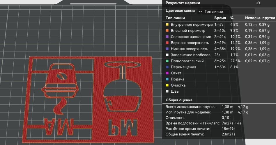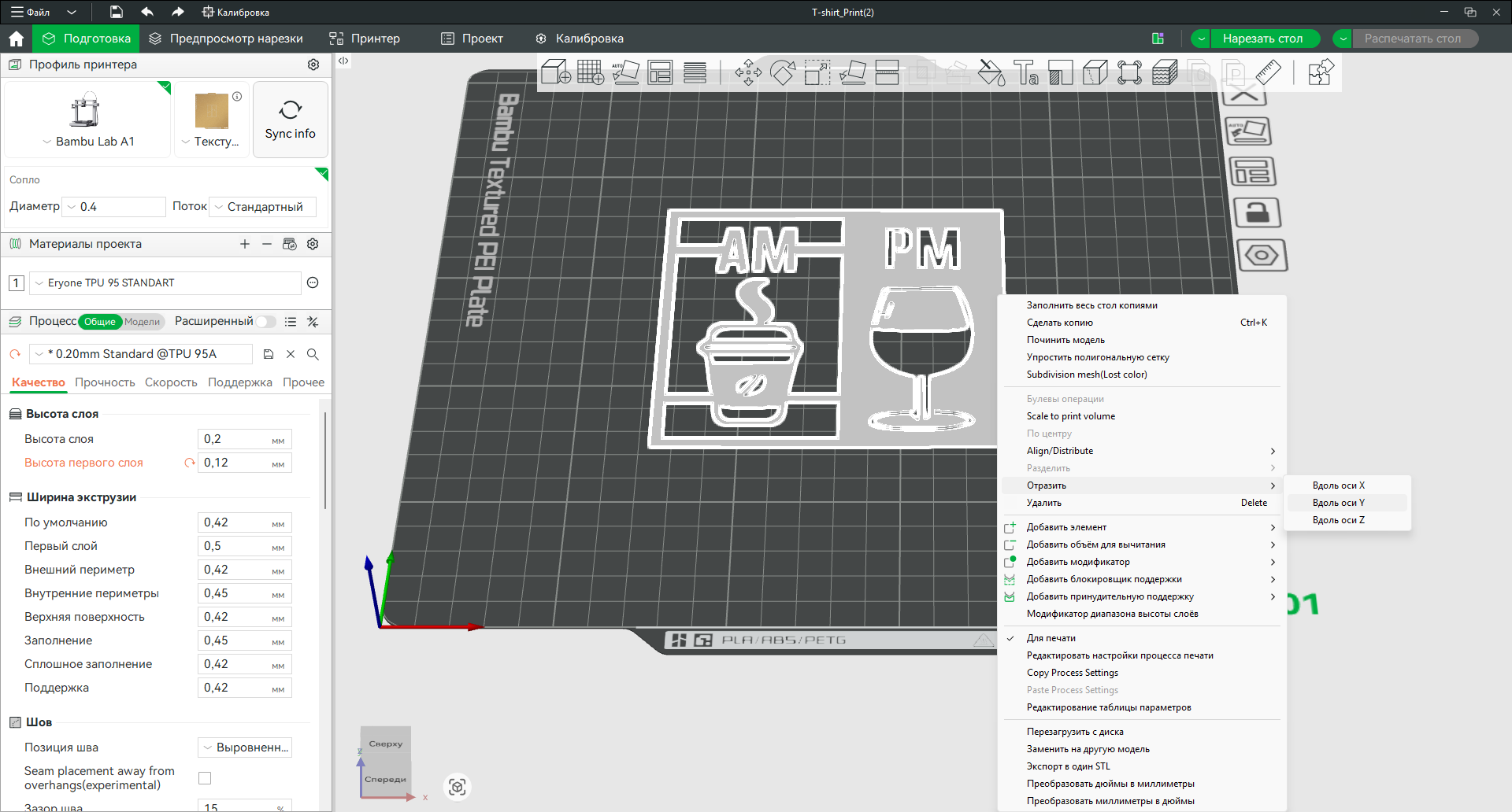 Макет в слайсере делаем толщиной 0,4 -0,5 мм. Меньше не нужно - плавится. После совета @TheRaven я специально заменил свой навороченный "придушенный" утюг))) на обычный, который гарантированно выдаёт 200 градусов, необходимых для плавки TPU-95 . В слайсере обязательно отражаем макет по оси Y чтоб верхний слой шёл на ткань.