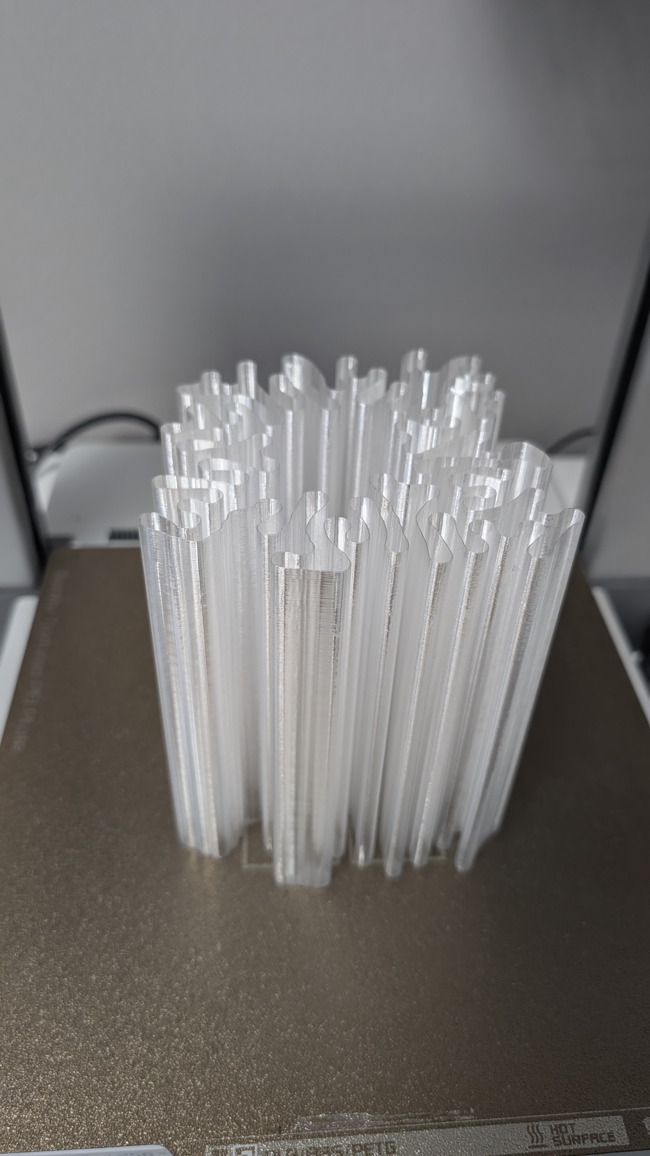 Ну сама печать прозрачным пластиком. Печать идёт в режиме вазы, с одной непрерывной стенкой и без швов. Так мы достигаем максимально возможной полу))) прозрачности.