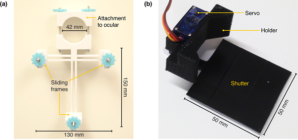 Для фотосъемки используется обычный смартфон, фиксируемый над окуляром с помощью 3D-печатных креплений и зажимов. За основу крепежа был взят дизайн с Thingiverse, позволяющий корректировать расположение гаджета для лучшей фокусировки. В верхней части микроскопа находится лампа, подсвечивающая клеточные образцы во время съемки. Под лампой была установлен 3D-печатный затвор, приводимый в движение сервомотором, синхронизированным с камерой в смартфоне.