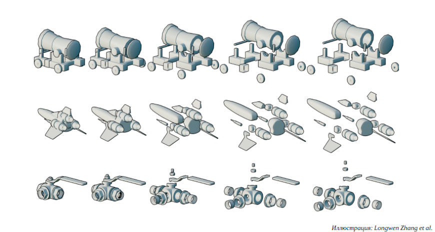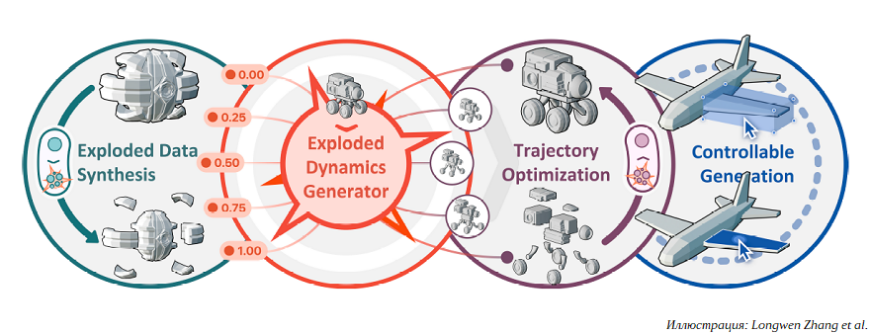Вычислительная модель полагается на принцип «генеративной взрывной динамики» (Generative Exploded Dynamics), позволяющий последовательно фрагментировать твердотельные объекты с сохранением геометрической и семантической целостности. Иными словами, система имитирует человеческую логику: если нужно разобрать на части модель того же автомобиля, то это будут не просто «нарубленные» куски, а конкретные компоненты — колеса, рама, кузов и так далее.