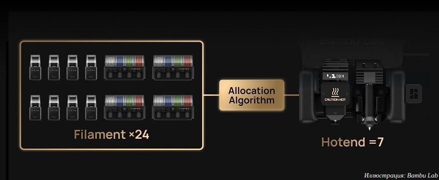 Новый тулченджер решает эти проблемы за счет быстрого переключения с одного хотэнда на другой без необходимости в прочистке, хотя работает это только в тех случаях, когда количество одновременно используемых материалов не превышает семи. Совместимость с AMS сохранена, так что при желании количество филаментов можно расширить дополнительными модулями, но ценой возвращения проблем с прочисткой.