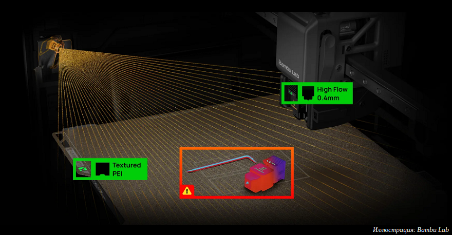 Как и положено топовому 3D-принтеру, Bambu Lab H2C напичкан электроникой и максимально автоматизирован. Аппарат самостоятельно калибруется, сканируя рабочую поверхность перед началом 3D-печати, проверяя совместимость установленных хотэндов и сопел с заданными расходными материалами и проводя диагностику. Уже в процессе 3D-печати одна из видеокамер отслеживает процесс построения с помощью машинного зрения, помогая автоматически выявлять сбои.