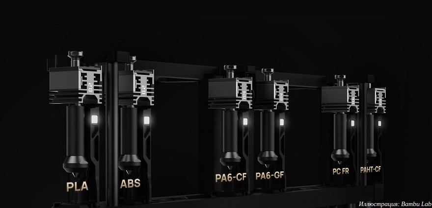 Почему семи? Потому что головка оснащена двумя хотэндами, но только один из них можно менять с помощью тулченджера. По задумке конструкторов, условно фиксированный хотэнд должен служить в первую очередь для нанесения специализированных опорных материалов, хотя при желании его можно загрузить любым филаментом. Один фиксированный хотэнд плюс шесть сменных, в сумме получаем семь.
