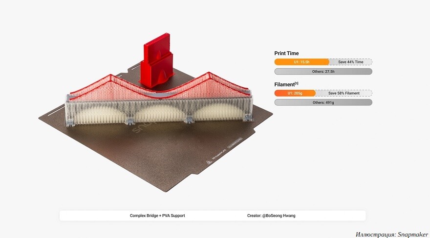 Помимо популярной кинематики CoreXY 3D-принтер Snapmaker U1 использует прошивку Klipper или что-то на ее основе с алгоритмами активного гашения вибраций (Input Shaping) и динамического контроля подачи расплава (Pressure Advance). Это, опять-таки, значительно увеличивает производительность, но теперь уже за счет повышения скорости позиционирования и ускорений, достигающих 500 мм/с и 20 м/с^2 соответственно.