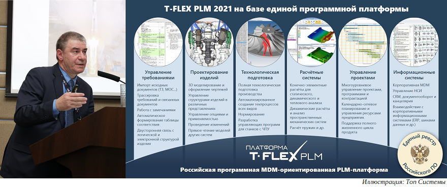 Доклад о возможностях программного комплекса T-FLEX PLM представил генеральный директор компании «Топ Системы» Сергей Кураксин. В выступлении «Российский программный комплекс T-FLEX PLM 2021» Сергей Анатольевич рассказал, чего достигла копания за последний год с точки зрения комплексного решения для управления жизненным циклом изделий, о преимуществах использования единой информационной платформы, об опыте использования систем комплекса T-FLEX PLM на российских предприятиях, а также о сотрудничестве с предприятиями ведущих корпораций при разработке решений.