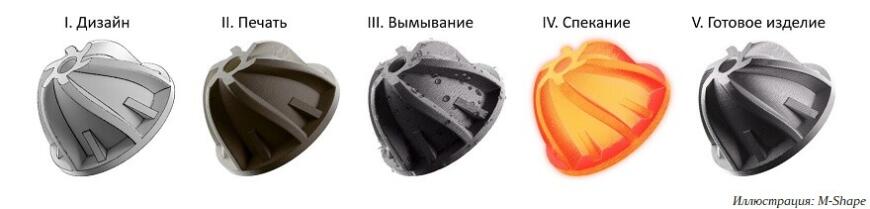 Компания M-Shape продвигает технологию 3D-печати полимер-металлических заготовок с последующим удалением полимерного связующего и спеканием в цельнометаллические изделия. Предприятие разработал формулу полимерного связующего, позволяющего производить материал как в форме металлополимерных гранул для литься под давлением, так и в виде гранул или филаментов для экструзионной FDM или FGF 3D-печати, сообщает пресс-служба фонда «Сколково».