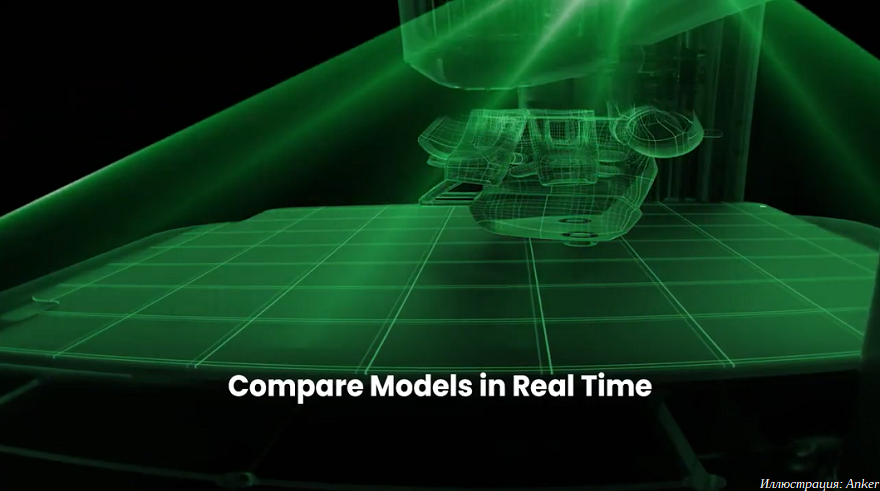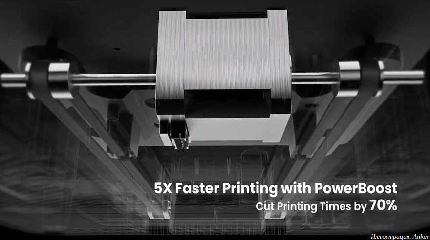 Система AnkerMake M5 построена по популярной «прушеподобной» схеме, но якобы развивает выдающуюся для «дрыгостолов» практическую скорость печати — до 250 мм/c. Высокая скорость и ускорения достигаются за счет системы PowerBoost, оптимизирующей позиционирование по оси Y с помощью мощного шагового двигателя, двойного ременного привода и стабилизирующих алгоритмов. Ускорения якобы достигают 2,5 м/с^2.