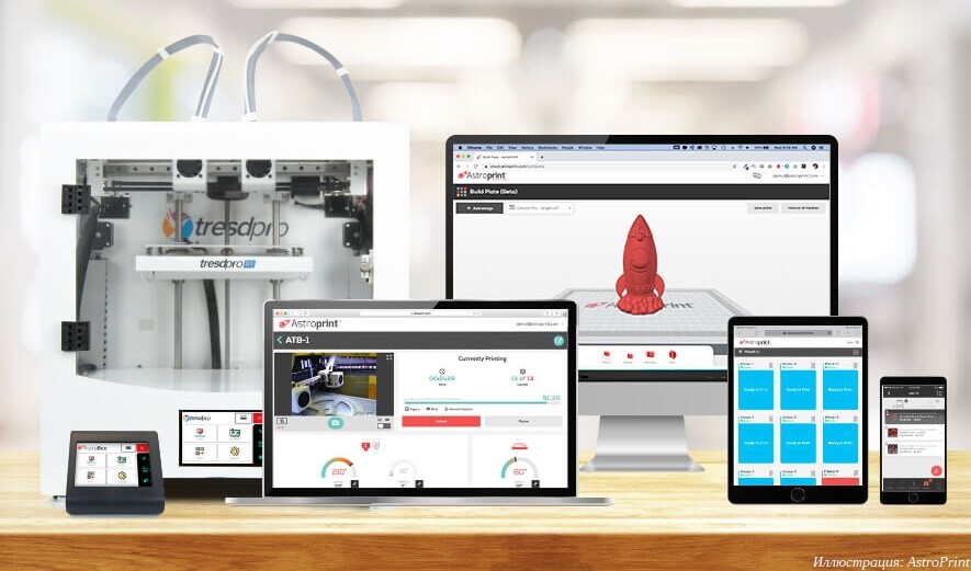 Компания AstroPrint, основанная в 2013 году и базирующаяся в Сан-Диего, известна как разработчик одной из наиболее популярных облачных платформ для удаленного управления 3D-принтерами. Платформа обслуживает более двухсот тысяч пользователей в ста тридцати странах, из них 60% находятся в США. В среднем платформа работает в связке с примерно двумя тысячами 3D-принтеров одновременно.