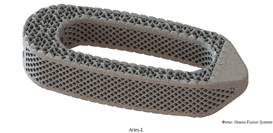 Техасская медицинская технологическая компания Osseus Fusion Systems выпустила титановые имплантаты Aries-TS для хирургии дегенеративных поражений поясничного отдела позвоночника. Специальные титановые вставки печатаются на 3D-принтерах по технологии селективного лазерного наплавления (SLM) и уже используются в хирургии.