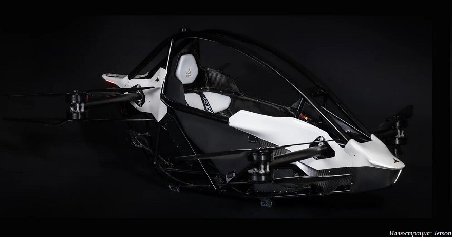 С виду этот летательный аппарат напоминает квадрокоптер, но построен по восьмимоторной схеме. Спаренные двигатели обеспечивают необходимый уровень безопасности: при отказе одного из них коптер сможет совершить мягкую посадку на оставшихся семи. На всякий случай в электролет дополнительно встроен парашют. Аппарат умеет висеть и садиться в автоматическом режиме с помощью лидара. Усиленная кабина выполнена по аналогии с гоночными автомобилями, а маркетологи компании называют Jetson One «небесной Формулой-1».