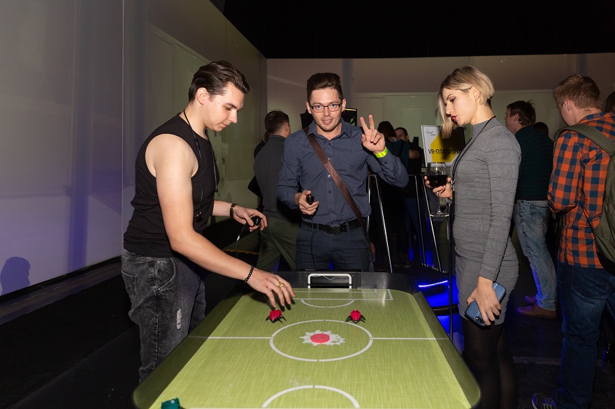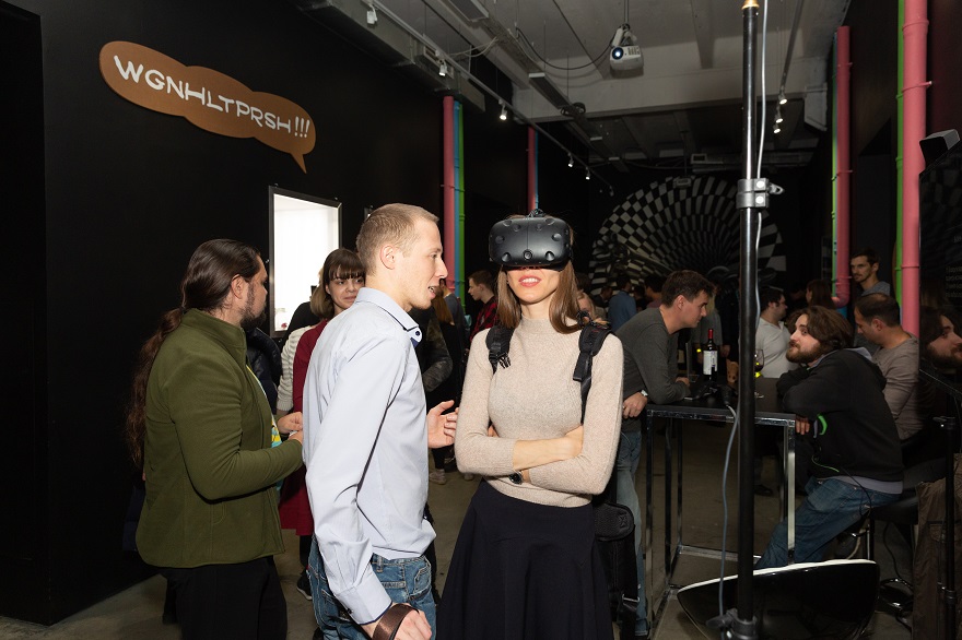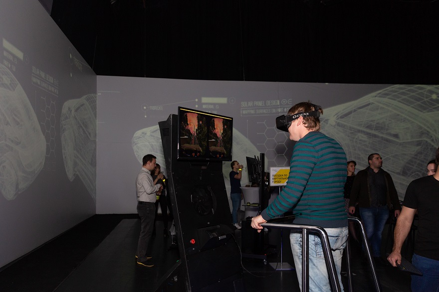 Одним из самых популярных мест на вечеринке стала зона VR. Многие гости принесли на флешках свои собственные проекты, выполненные в ПО Autodesk, и имели возможность побродить по ним в виртуальном пространстве с помощью VR-шлема. Причем сделать это они могли вместе с другом — специальная система позволяла находиться в этом пространстве вдвоем.