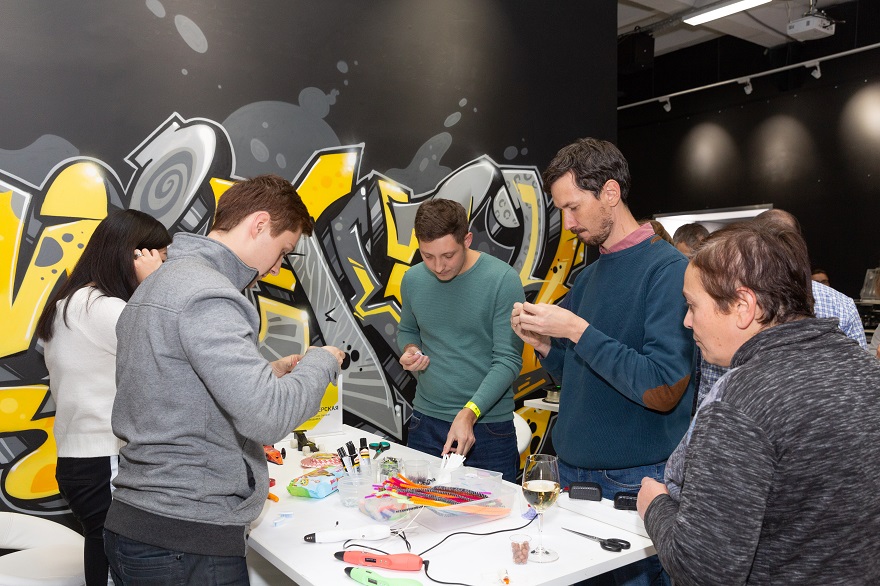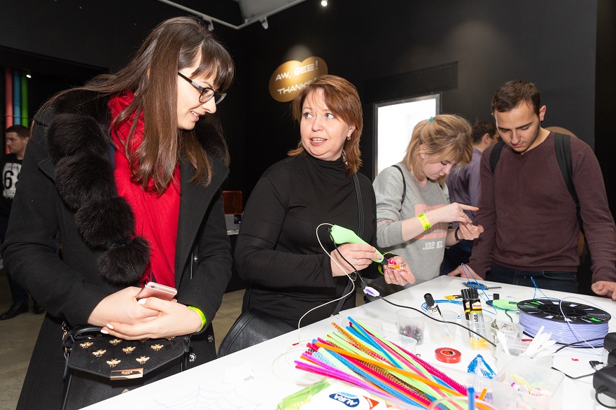 На Future Night каждый желающий мог сделать на память сувенирный «объект будущего» — собственный мини-робот BeetleBot или VR-очки. Гости кастомизировали готовые работы с помощью деталей, которые тут же печатал 3D-принтер (конечно, все они были спроектированы во Fusion 360) и 3D-ручек. Подставку для робота фрезеровали тут же на станке, причем гостям предлагалось поучаствовать в его запуске и узнать, как он на самом деле работает.