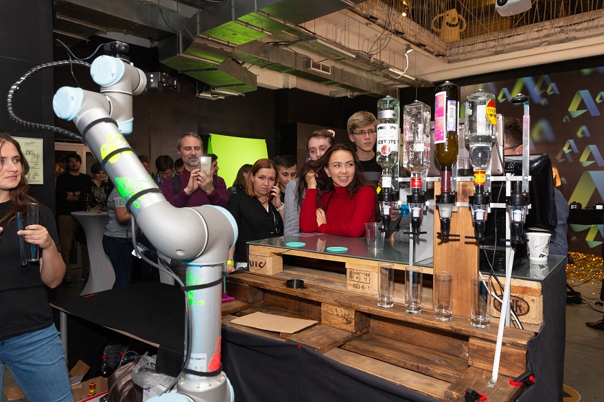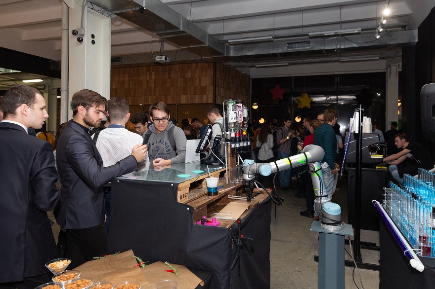 Все это дополнялось футуристическими сетами от диджея-киборга (о нем уже писали тут: именно он демонстрировал протез-синтезатор на Mercedes Benz Fashion Week). И в лучших традициях научно-популярных фильмов о будущем напитки гостям разливал робот-бармен — он не только наполнял стаканы щедрой рукой-манипулятором, но и сам готовил и смешивал коктейли.