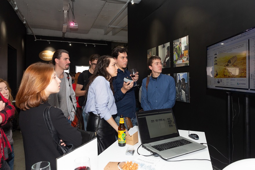 Первое, что обращало на себя внимание — это атмосфера места, где проходила вечеринка, мультимедийный зал ArtPlay, знаменитый своими 3D-эффектами. Autodesk воспользовался ими для того, чтобы организовать настоящую мультимедийную выставку с самыми разными экспозициями — от каркаса сиденья для самолетов Airbus, спроектированного с помощью искусственного интеллекта, проекта боевого робота и робота, печатающего корабельный винт, до уроков черчения на одном из первых AutoCAD.