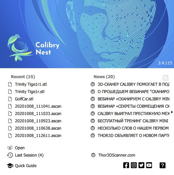Экран приветствия. Этот всплывающий при запуске экран дает пользователям возможность быстро находить последний рабочий проект, а также последние новости от Thor3D. Благодаря экрану приветствия новые пользователи смогут пройти небольшое обучение по работе с программным обеспечением.