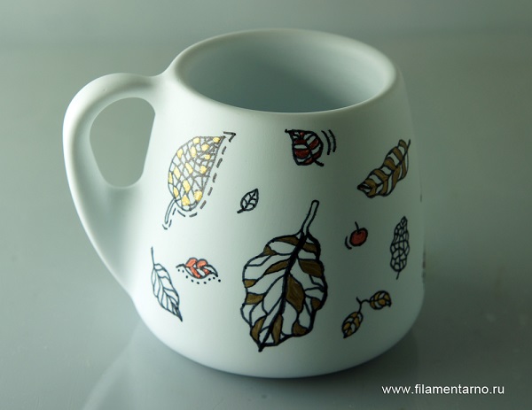 Кружка «Осенняя»Напечатана командой Filamentarno из новейшего фирменного пластика CERAMO слоями 0,2 мм и соплом 0,4 мм без поддержек или обдува. Постобработка наждачной бумагой, декорация фломастером и акриловыми красками. Подробнее о керамических имитаторах CERAMO и CERAMO-TEX читайте в блоге Filamentarno.