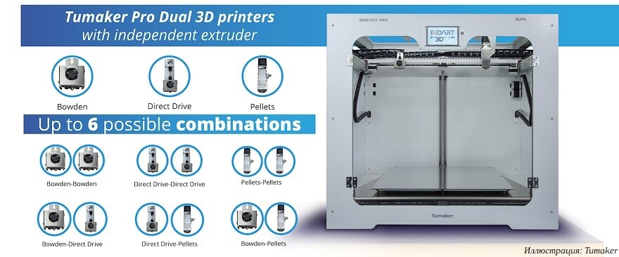 Компания Tumaker предлагает линейку FDM 3D-принтеров Pro Dual с кинематикой IDEX. Системы предлагаются в разных размерах и с широким выбором комбинаций экструдеров — директ и боуденовскими для 3D-печати филаментами и шнековыми для работы с гранулированными полимерами.