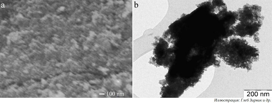 Изображения поверхности образца, полученные методом сканирующей (a) и просвечивающей (b) электронной микроскопии