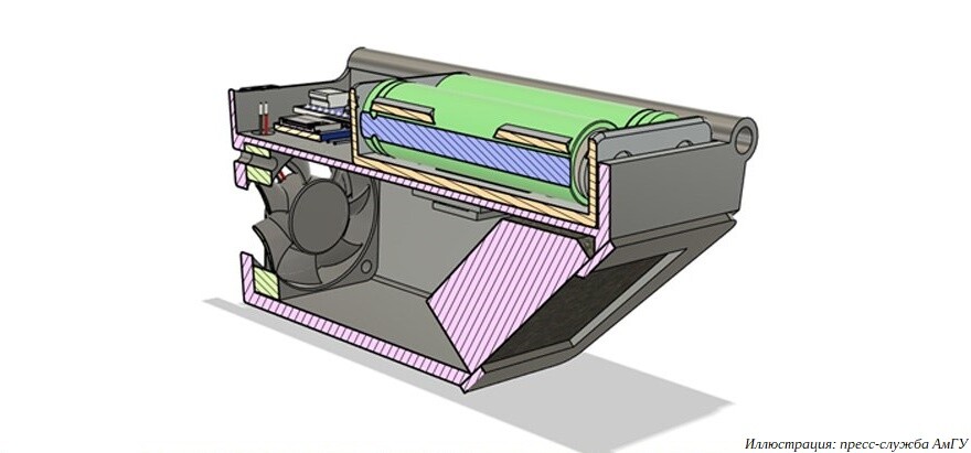 «Было несколько вариантов — с нагнетателем воздуха или без него, то есть с использованием воздушного потока, который создается за счет вращения винтов БПЛА, либо формируемым специальным вентилятором. Аналогов нашему прибору, которые бы решали определенные нами задачи, мы не нашли, поэтому подали заявку на изобретение в Роспатент», — рассказал Дмитрий Фомин.