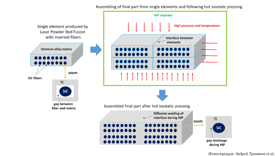 «Композитные детали, состоящие из матрицы титанового сплава с армирующими волокнами карбида кремния, впервые были успешно изготовлены с использованием нового подхода, сочетающего лазерную плавку в порошковом слое и горячее изостатическое прессование. Способ предполагает, что волокна могут быть помещены в матрицу после изготовления единичного элемента. После этого из отдельных элементов можно собрать деталь с окончательной формой. Консолидация конечной детали может быть выполнена методом горячего изостатического прессования. Высокое давление и температура при этом будут вызывать усадку зазоров между матрицей и волокном и способствовать диффузионному соединению элементов матрицы. Дальнейшая вставка волокон и сборка нескольких одиночных элементов позволяет получить заготовку с равномерным распределением волокон в объеме», — рассказал ведущий эксперт лаборатории гибридных аддитивных технологий НИТУ «МИСиС» Андрей Травянов.