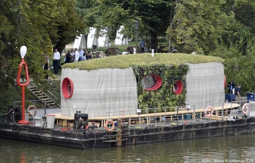 Еще один интересный проект реализован в 2020 году: чешская компания Scoolpt под руководством художника-скульптора и архитектора Михала Трпака построила 3D-печатный дом площадью сорок три квадратных метра, водруженный на понтон. Конструкция демонстрировалась возле Стрелецкого острова.