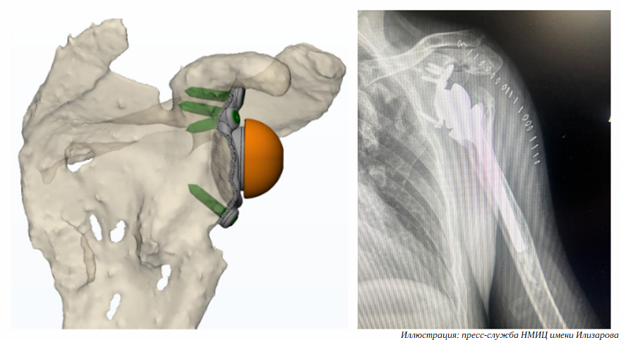 «В такой ситуации невозможно надежно фиксировать лопаточный компонент. Даже если бы это получилось, биомеханика эндопротеза плечевого сустава была бы крайне нарушена. Поэтому совместно с московскими инженерами нами был разработан индивидуальный лопаточный компонент реверсивного эндопротеза с помощью аддитивных технологий», — рассказал руководитель Клиники реконструктивно-восстановительной хирургии крупных суставов НМИЦ имени Илизарова Николай Чирков.