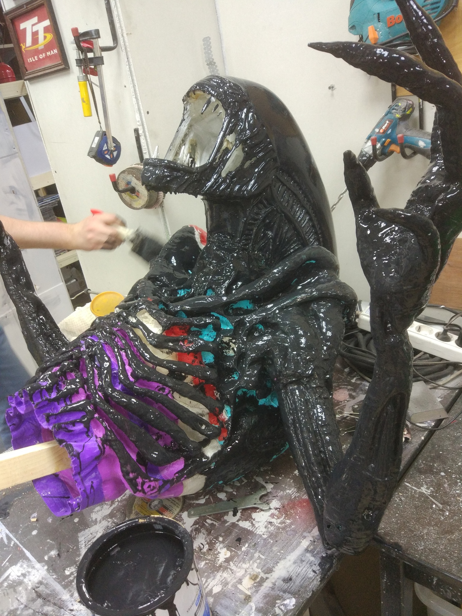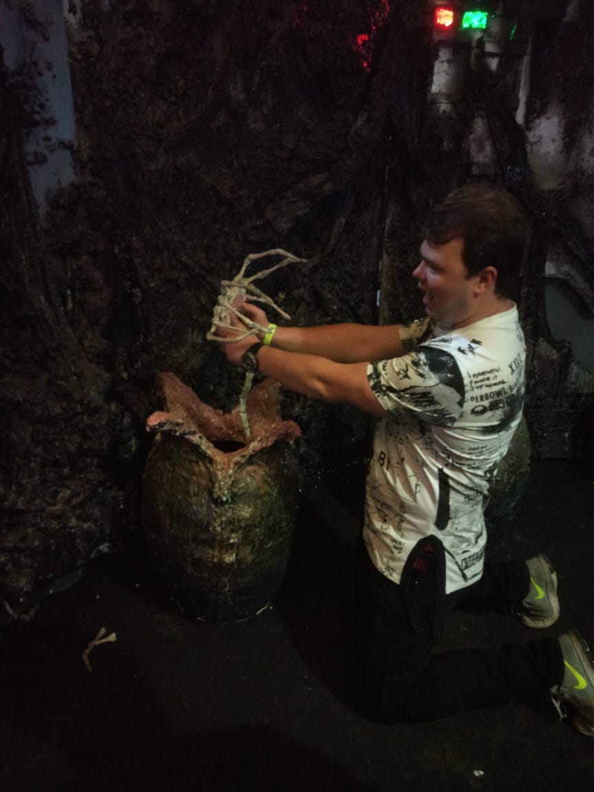 1. Первая фотозона посвящена фильму Чужой, франшизе этого фильма в этом году исполнилось 40 лет и это событие мы захотели как-то отметить. Решено было сделать фигуру Чужого в оригинальном размере (или близким к нему), атрибуты из фильма и задний фон. Из атрибутов мы успели сделать саму фигуру, 3 яйца и мертвого лицехвата (в планах было больше, но, банально не успели). В итоге вот что получилось: