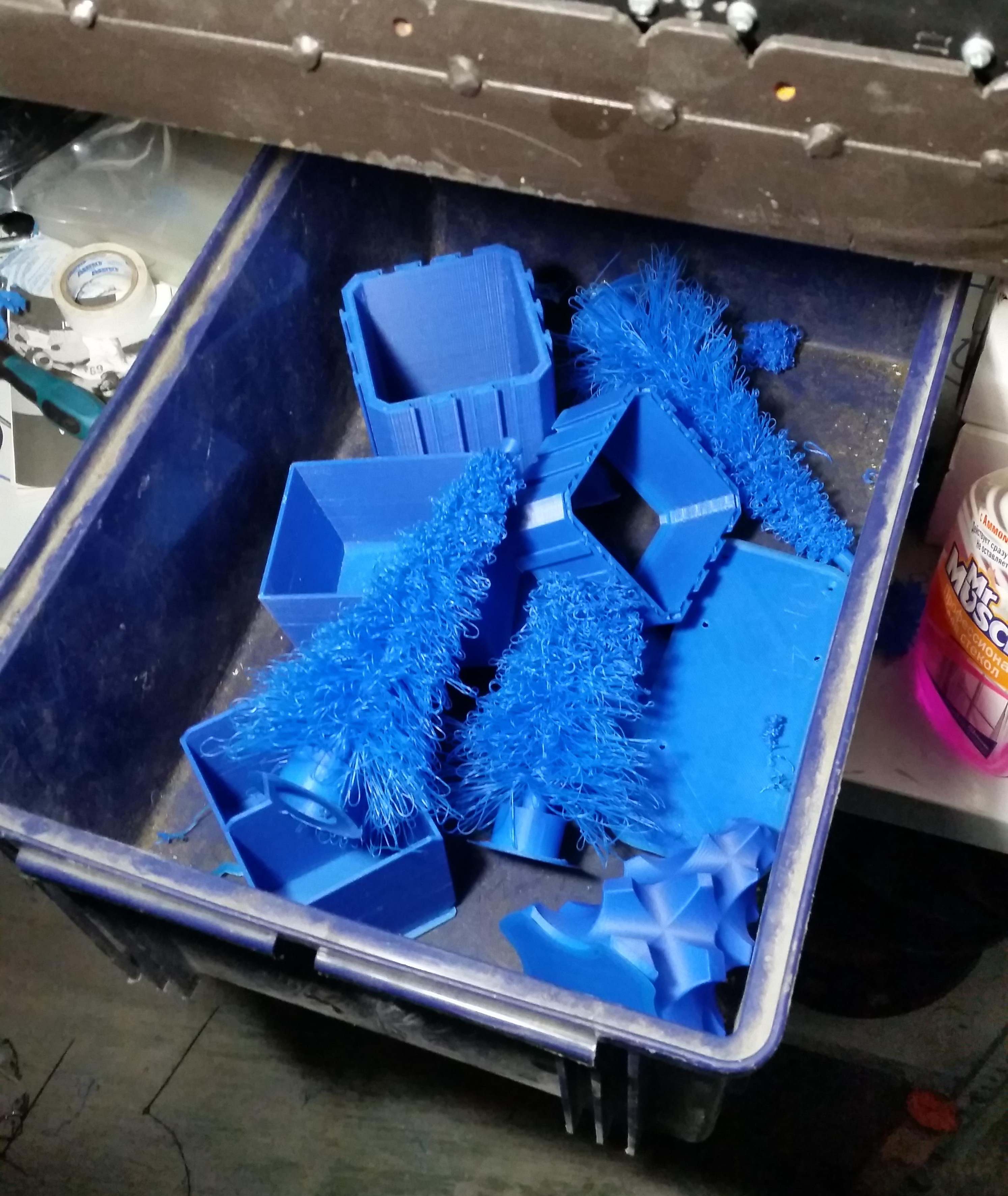 Я тоже хотел с попкорном, но не дело отдыхать, когда творятся такие дела. Началось с филамента. Я так рвал мозг окружающих про цвет, что обнаружил печать черным филаментом на черном столу! А потому что забыли купить другой цвет, хотя обсудили до нюансов. Поиски обнаружили катушку голубого филамента, которому больше двух лет. Теперь, почти израсходовав всю катушку, можно с уверенностью сказать, что наши филаментисты растут качественного. За что спасибо им и конкуренции.