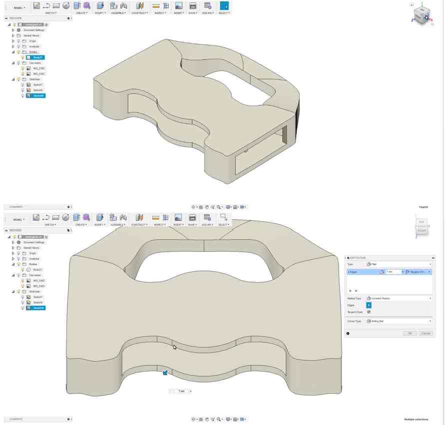 2) экструзией выдавливаю две части в соответствии с измеренными значениями3) С помощью команды «оболочка» делаю две внешних части фиксатора4) На одной из плоскостей фиксатора делаю эскизы для внутренней перегородки, и угловых элементов5) С помощью команды экструзия соединяю две половины угловыми элементами и центральной направляющей6) После этого объединяю все элементы в одно тело, и с помощью команды Fillet скругляю все резкие переходы7) На этом этапе решил распечатать черновой вариант, посмотреть, как выглядит вживую, и что необходимо скорректировать. Печатал из ABS. Скорость 60, температура стола 90, сопло 250. Без обдува. Заполнение 10%