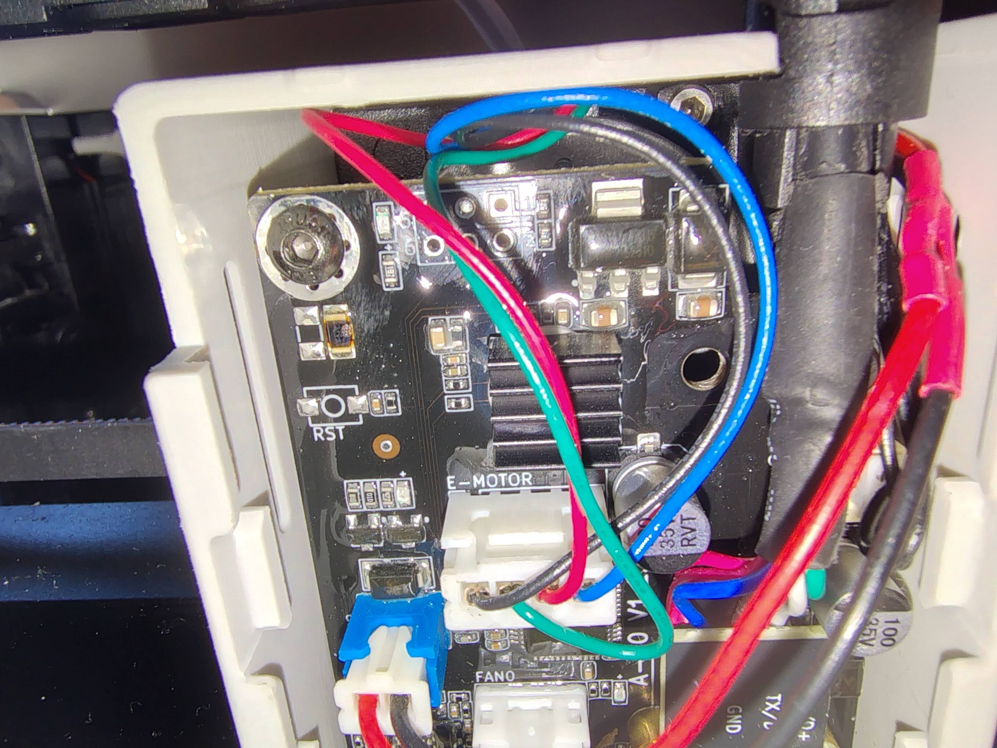 Свободных пинов на материнке — кот наплакал. Z1/Z2 не опознаны, Probe0 и Probe1 заняты SFS-датчиком. Пришлось импровизировать: взял пин PA1 на голове (датчик наличия филамента). Провод кинул тривиально — снаружи, так как в заводскую «кишку» его уже не впихнуть.