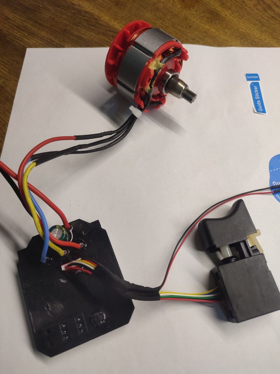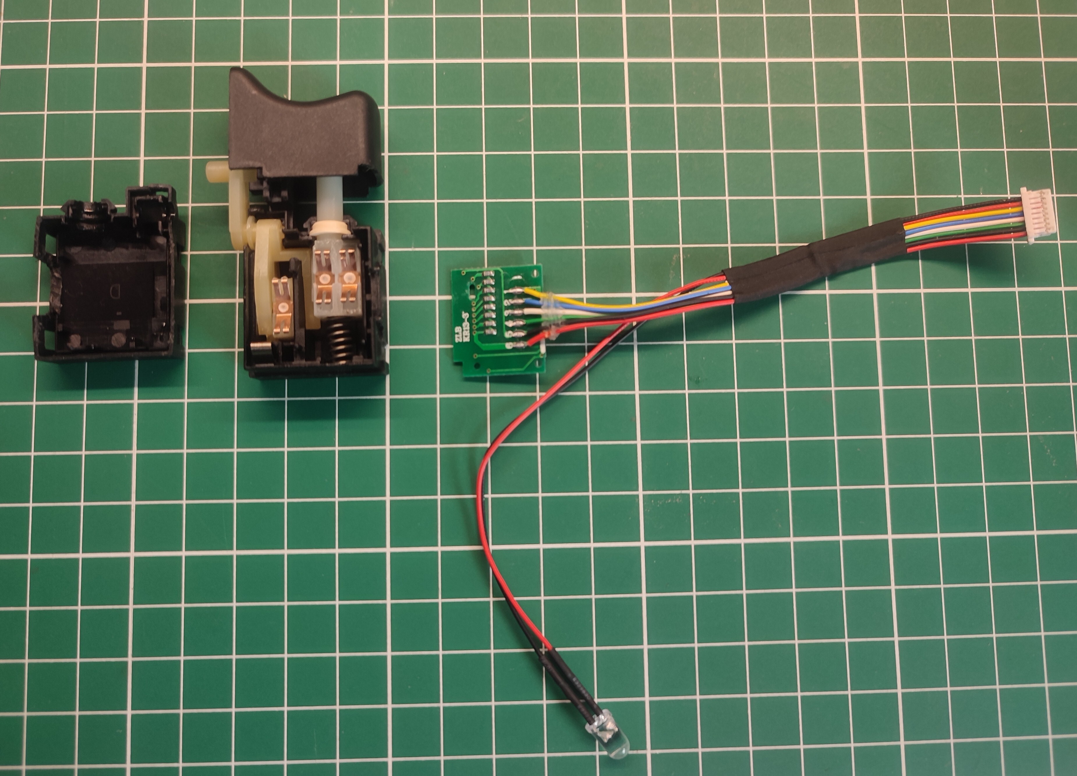 Мне интересен этот комплект для самодельных настольных станков. Пульт управления(курок) не подходит для настольных станков, нужна постоянная подсветка рабочего места /отдельные органы для включения, управлением скоростью и направлением вращения двигателя/ аварийный стоп. Разбираю пульт управления(курок).