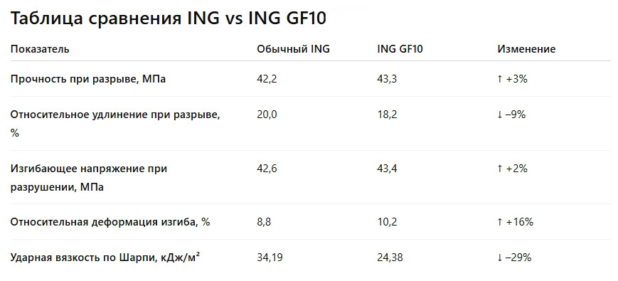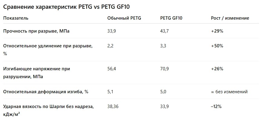 Испытания композитного PETG GF10 выполнены в тех же условиях, что и испытания обычного PETG. Полученные данные в таблице протокола позволяют напрямую сравнить обычный PETG и PETG GF10, демонстрируя рост прочностных характеристик и жёсткости вследствие армирования стекловолокном.