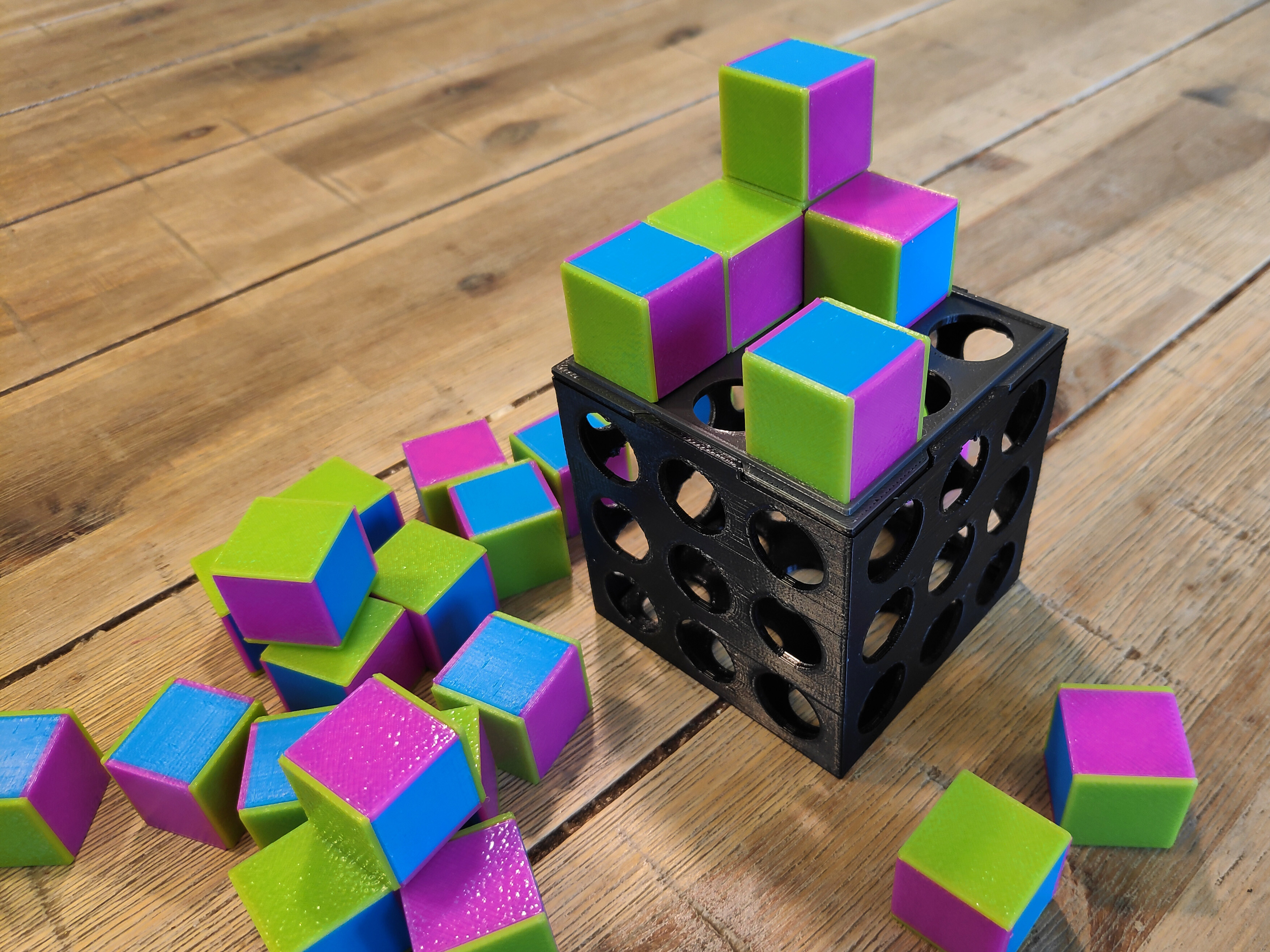 Печать и сборка не требует усилий. Поддержки при печати не нужны, склейка или обработка также не требуется. Всего необходимо 4 типа деталей: основа кубика и вставка, а также коробка и её крышка. У основы кубика верхняя и нижняя часть печатаются вторым цветом с помощью замены нити на паузе, а боковые части кубика просто вставляются в пазы.