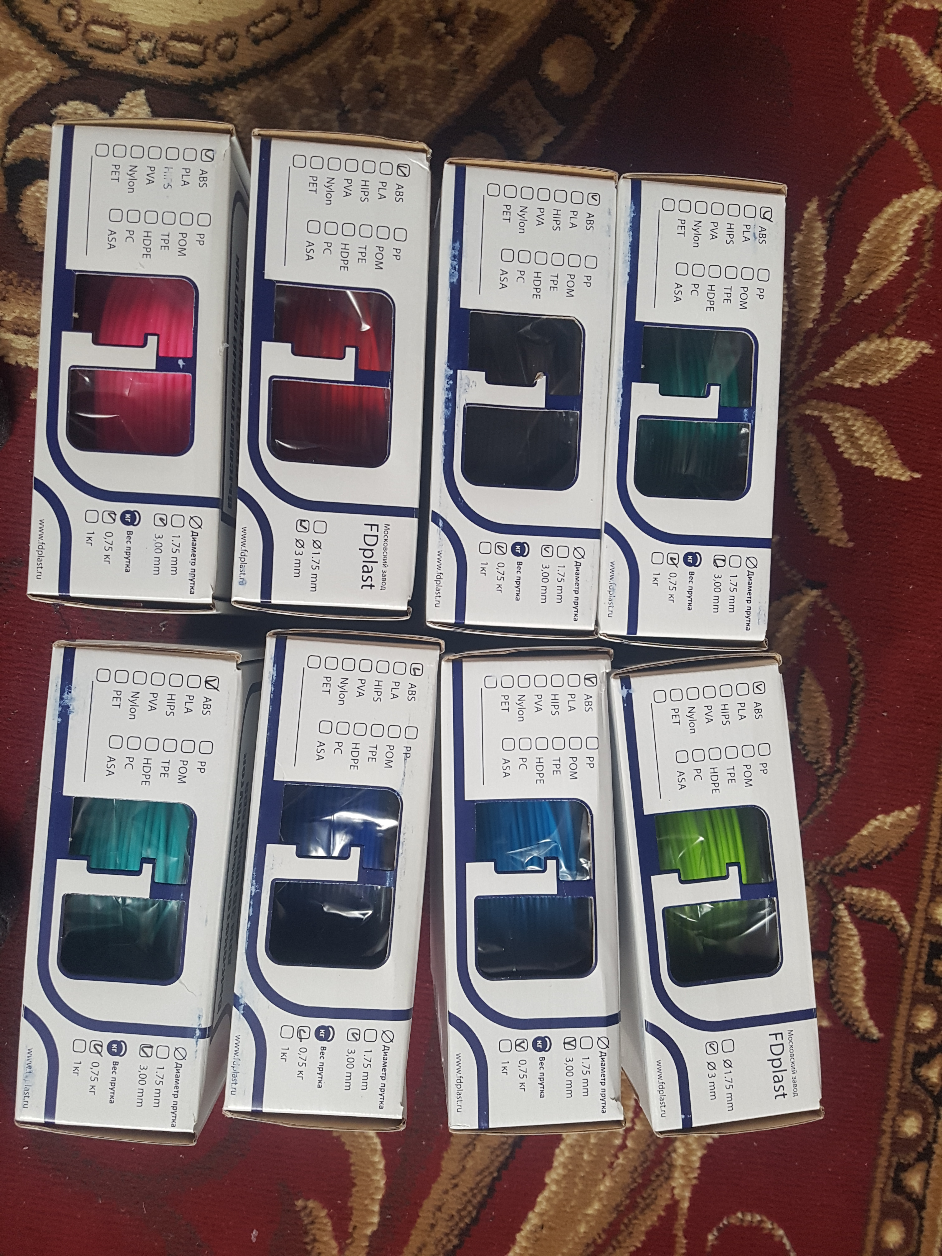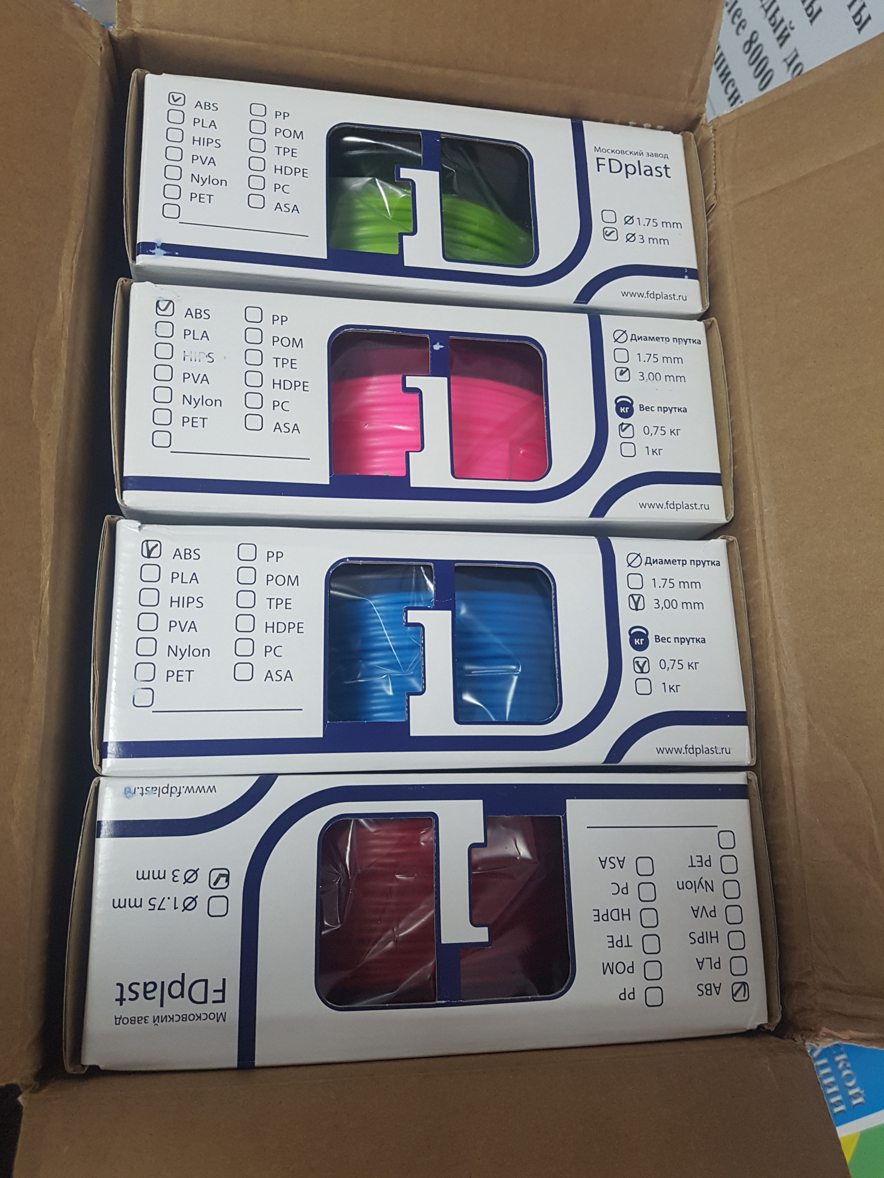 Хорошая цена на филамет 3 мм бухта по 750 гр. за 398 рублей от Fdplasta. Купил 8 шт. Разных цветов. Итог вышел 3184 рубля и + доставка 800 рублей. 4000 рублей все обошлось. Вес посылки 9 кг. Чистый вес филамета 6 кг. Как хорошо, что на 3 мм прутке сижу. ))) дошло где-то за неделю. Даже вроде быстрее. Просто на праздник попал и не смог посылку с почты за брать.
