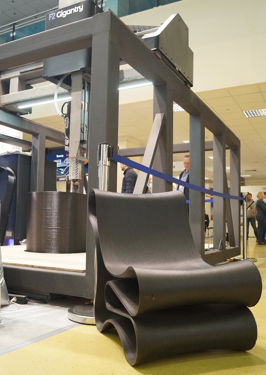 Совместно с компанией «Ф2 Инновации» мы продемонстрировали возможности этой технологии с помощью крупноформатной аддитивной системы F2 Gigantry. В стандартной конфигурации это оборудование обладает областью построения размером 4х2х1 метр и оснащено шнековым экструдером с производительностью до 10 кг/ч.