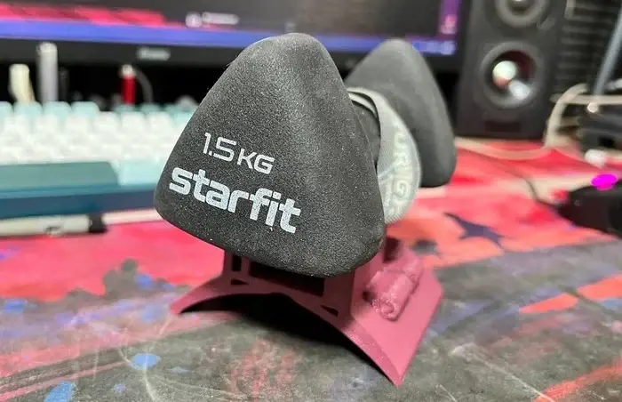 2. Что бы проверить прочность на удар стенок модели и качества межслойной адгезии, с тинга была взята модель крепления и распечатана с 10% заполнением в 3 стенки. Эта модель была сброшена с высоты 1.7 метров с привязанной гантелей 1.5 кг. о бетонный пол. Как результат — модель практически не повредилась, лопнув в тонкой части, но не по шву, что говорит о высокой адгезии слоёв этого филамента. В остальном модель была без повреждений.