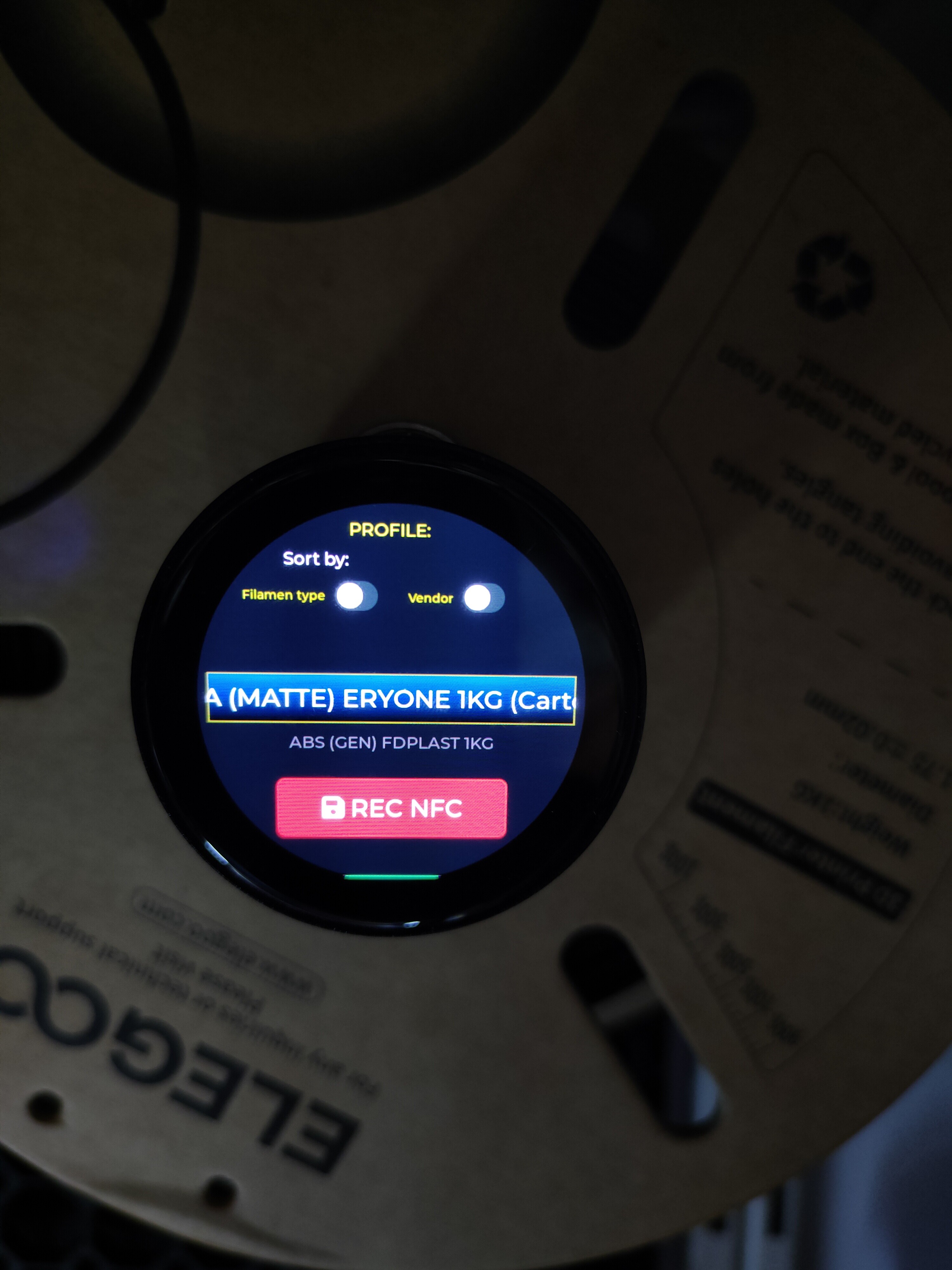 NFC - на катушку вешается обычная метка стандарта MIFARE Classic на ней хранится ID профайла. Метка естественно перезаписываемая. Подносишь катушку с меткой и профиль выбирается автоматически. Так же происходит и запись - выбрал профиль, нажал кнопку "Запись" и поднес катушку с меткой.