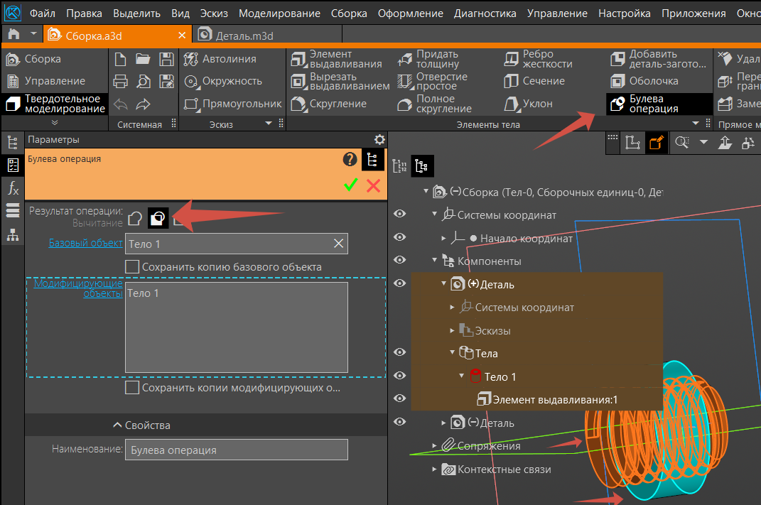 2.4 Вырезаем полученной (увеличенной) заготовкой с помощью булевой операции резьбу в заготовке, где требуется получить внутреннюю резьбу.