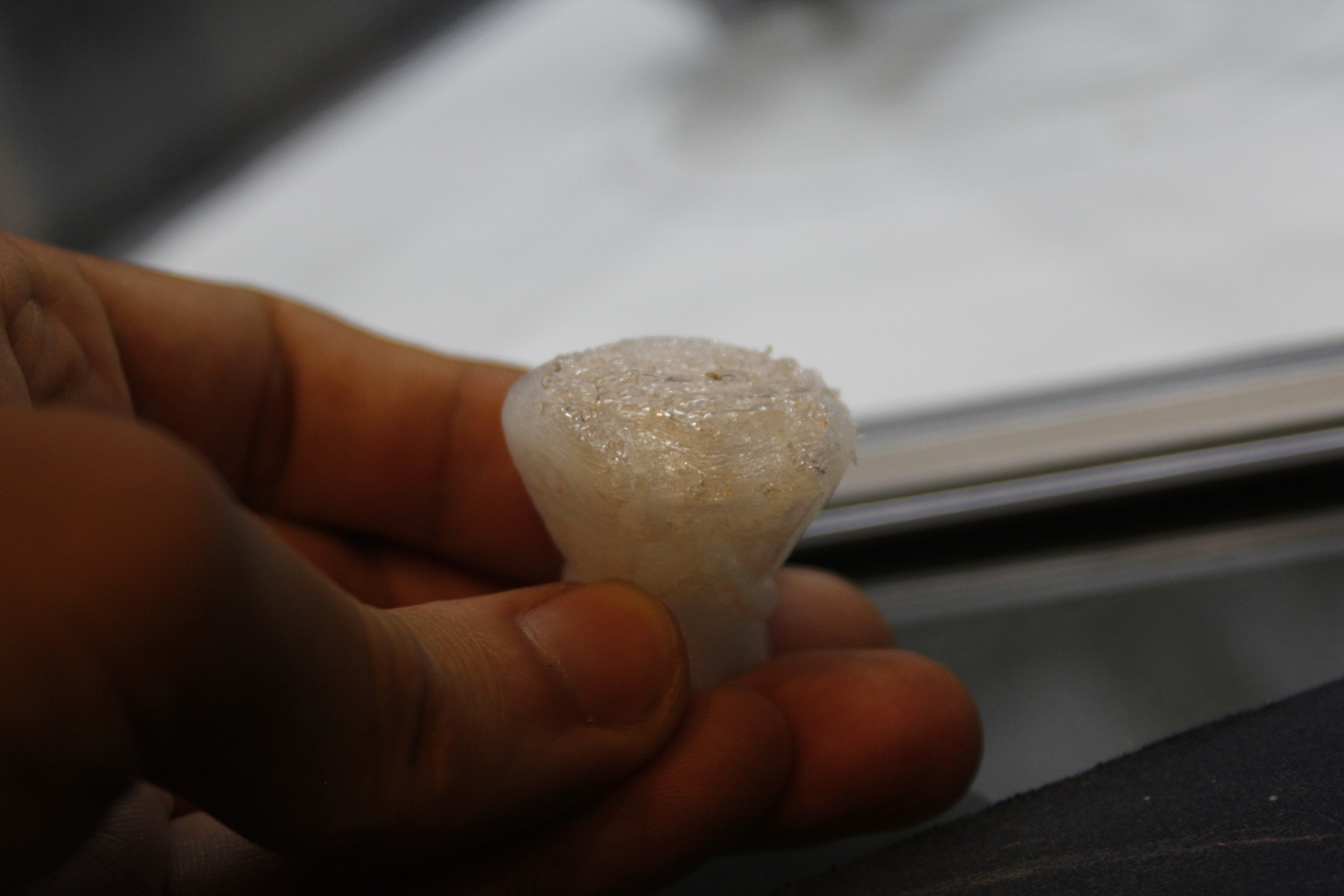 Далее, тестовый кубик который я печатал, был с искривлеными гранями и неравномерной подачей. Я попробовал заменить тип материала с PLA на SBS. Взял прозрачный Filamentarno. И результат получился весьма неплохой. SBS более мягкий и с ним тут нет проблем в подаче. Острые зубцы экструдера прекрасно подружились с прутком. Кроме того в силу своей особенности SBS позволяет увеличивать подачу. Первый слой я клал с шириной в 2,4 мм при диаметре сопла 0,4