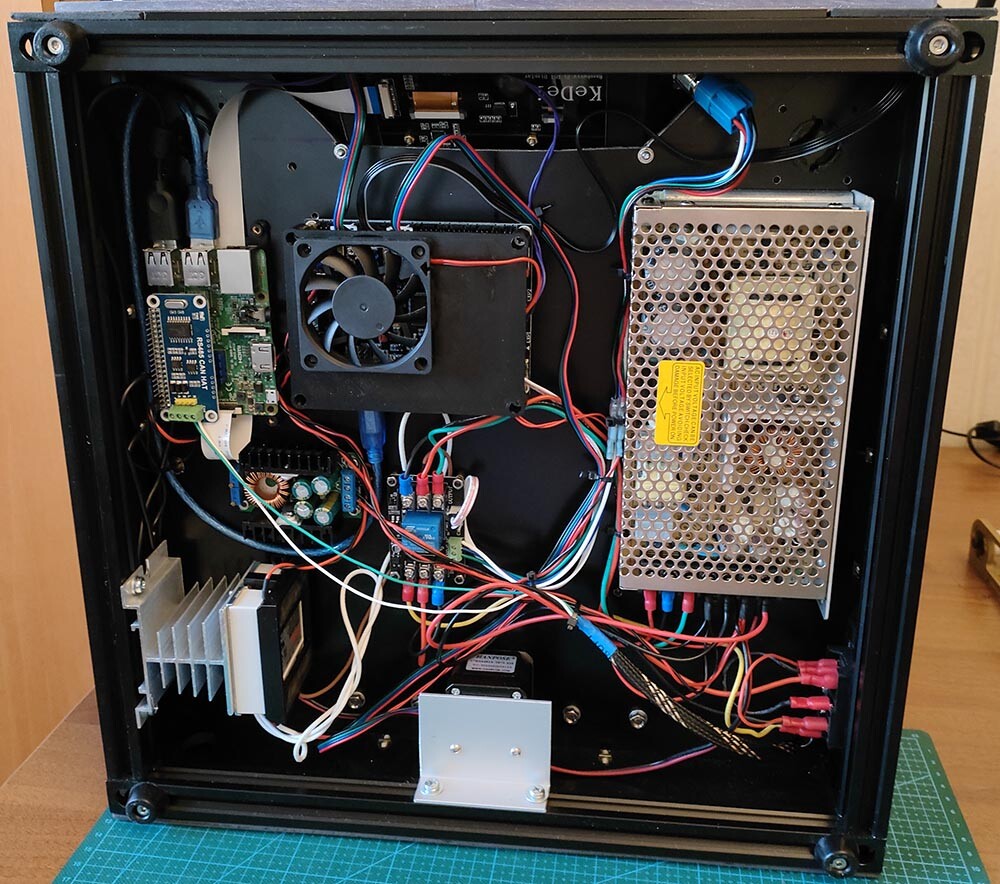По электронике было заменено всё, плата SKR 1.4 turbo, малина, БП минвел без вентиля, оставил только плату автоотключения родную. Экран как и выше писал 4.3 дюйма. CAN hat на малине, CAN модуль на башке.