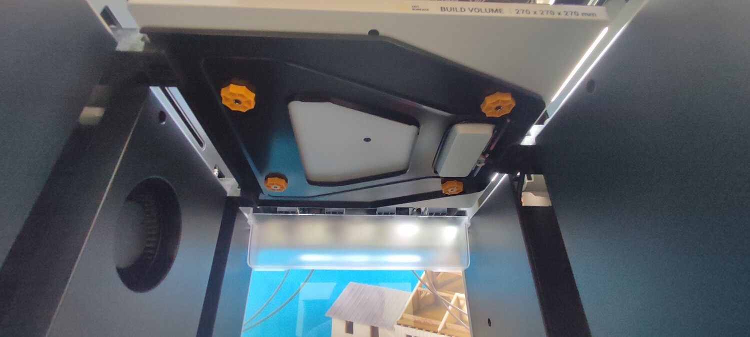 Внутри принтера расположен стол с уложенной двухсторонней магнитной PEI-пластиной и возможностью подогрева до 100°C. Область печати составляет вполне приличные 270x270x270 мм.