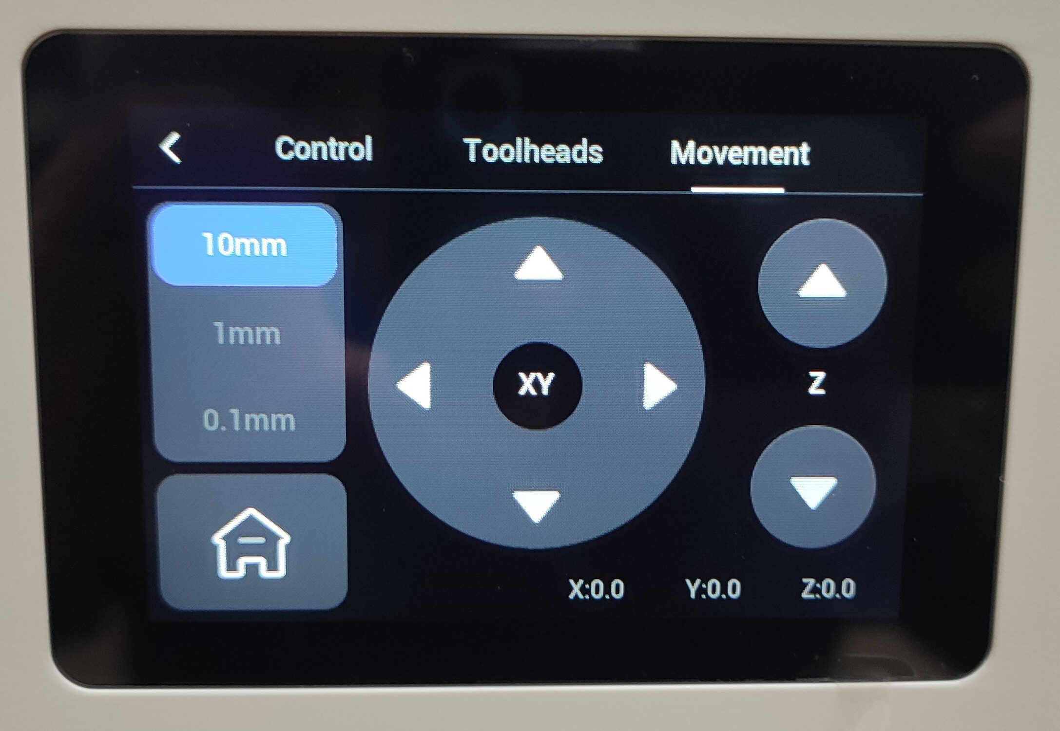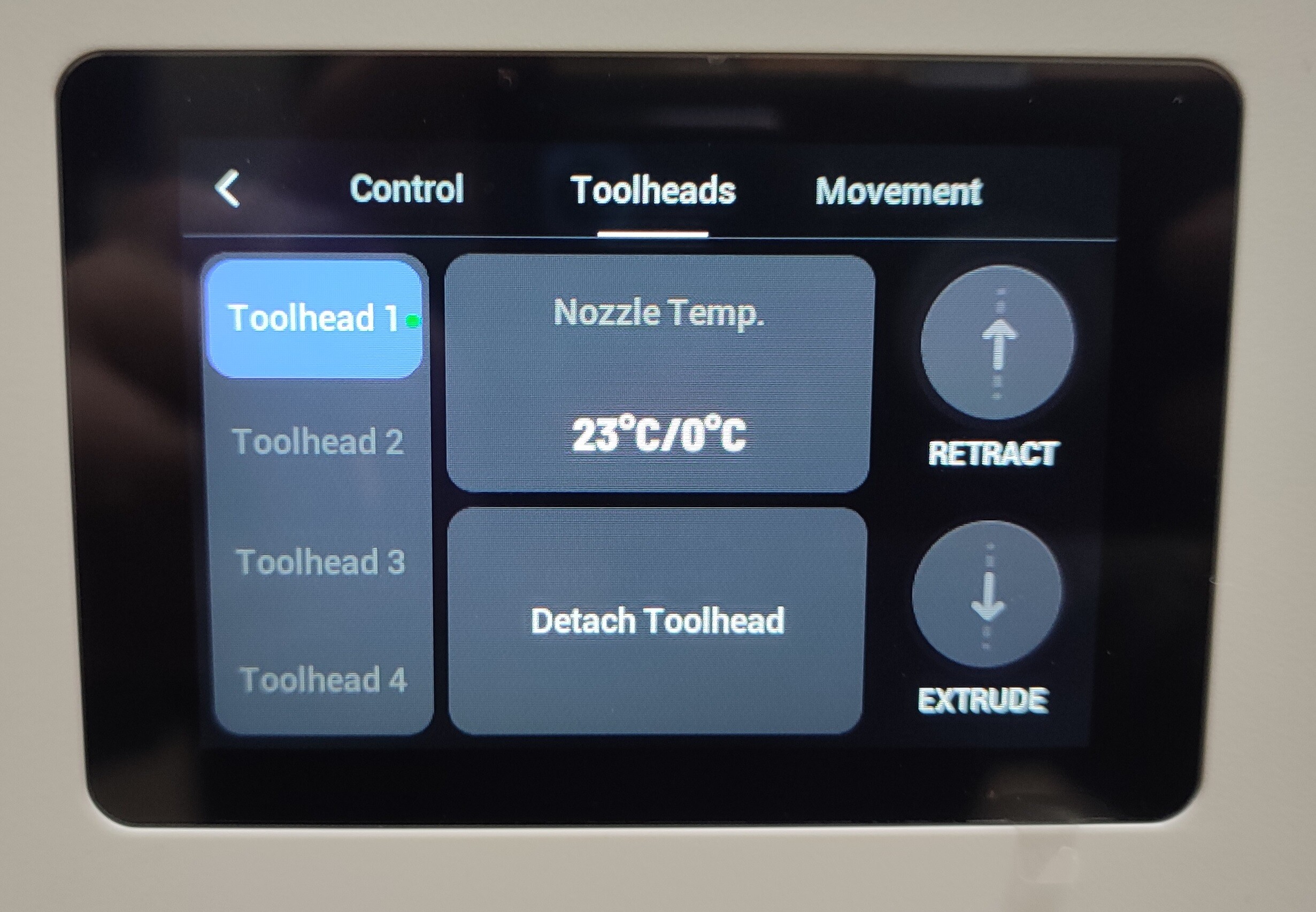 Каретка двигается по цилиндрическим направляющим и использует интересный алгоритм охлаждения печатающих головок при выполнении некоторых операций, например калибровки. Для охлаждения активного печатающего блока она подносит его к дополнительному вентилятору камеры, который тут же включается для быстрого охлаждения хотенда, после чего каретка ставит блок на свое место.