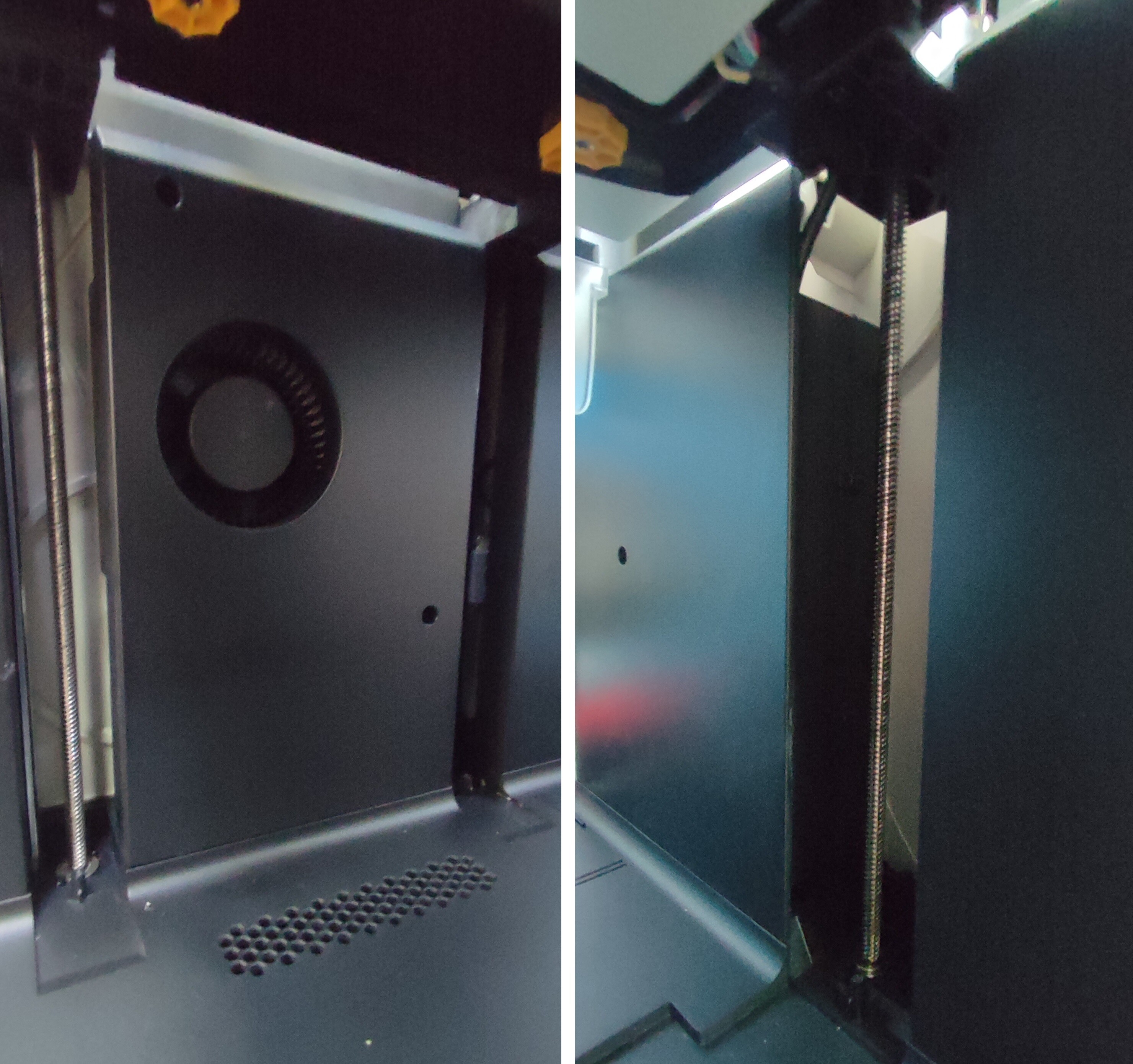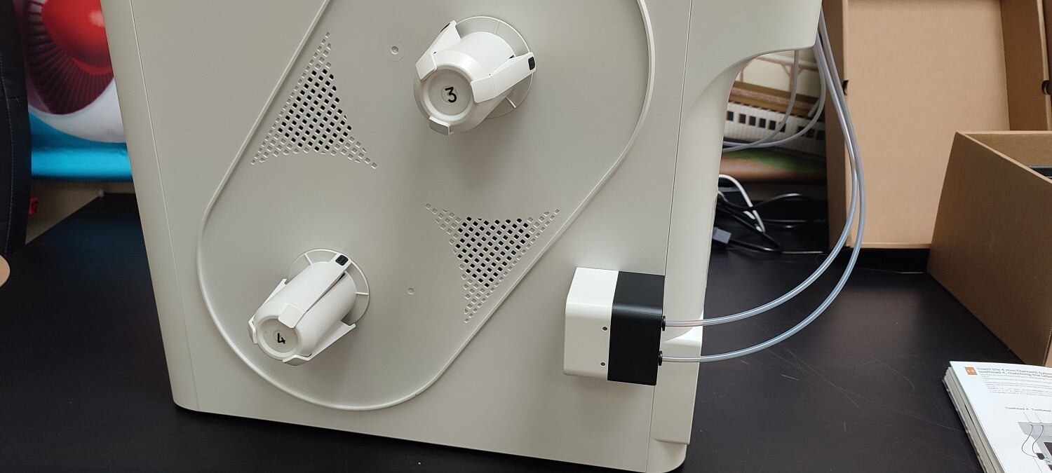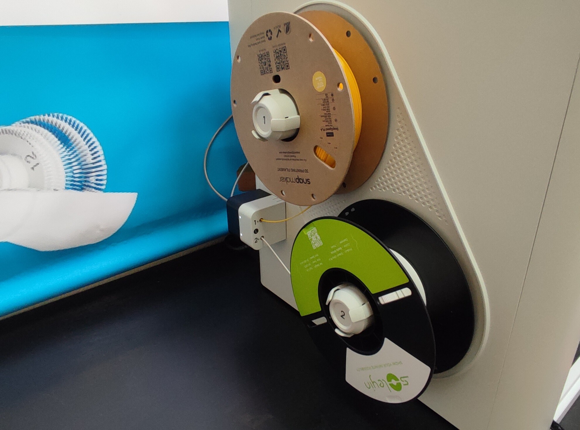 Механизмы подачи и шпули для филамента крепятся на внешние панели принтера слева и справа.