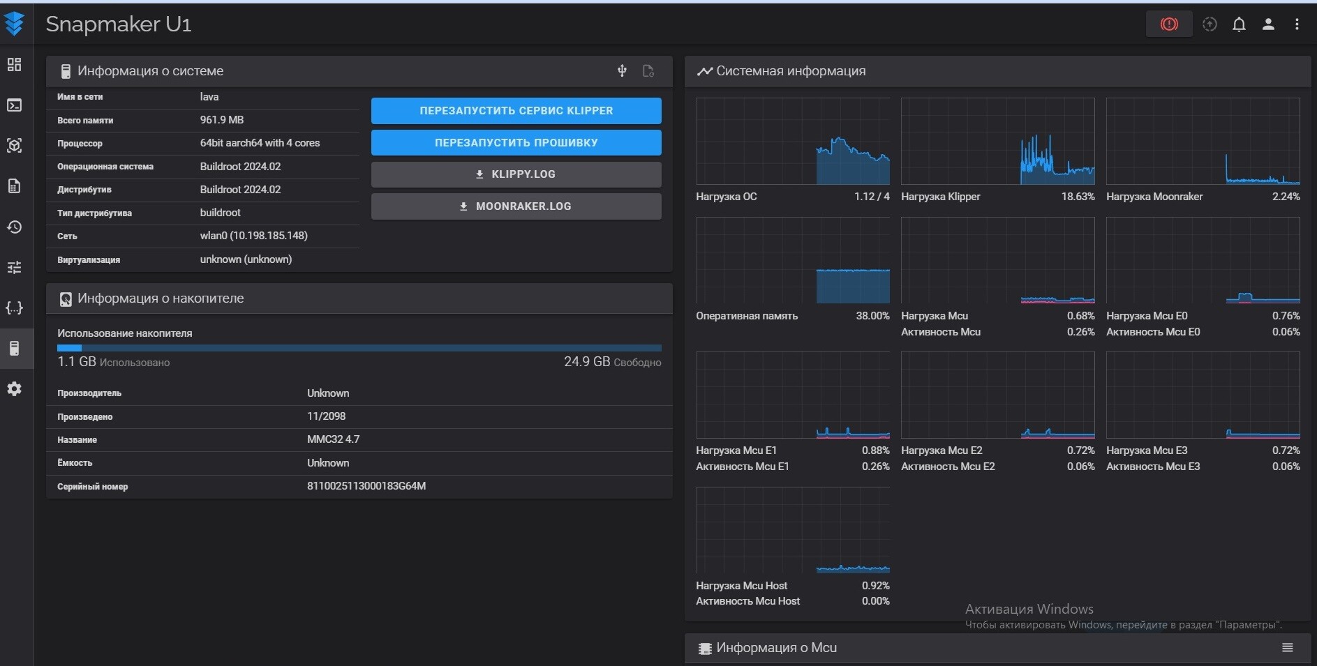 Доступ к Fluidd — через веб-интерфейс. Сетка стола после первого запуска выглядит так.