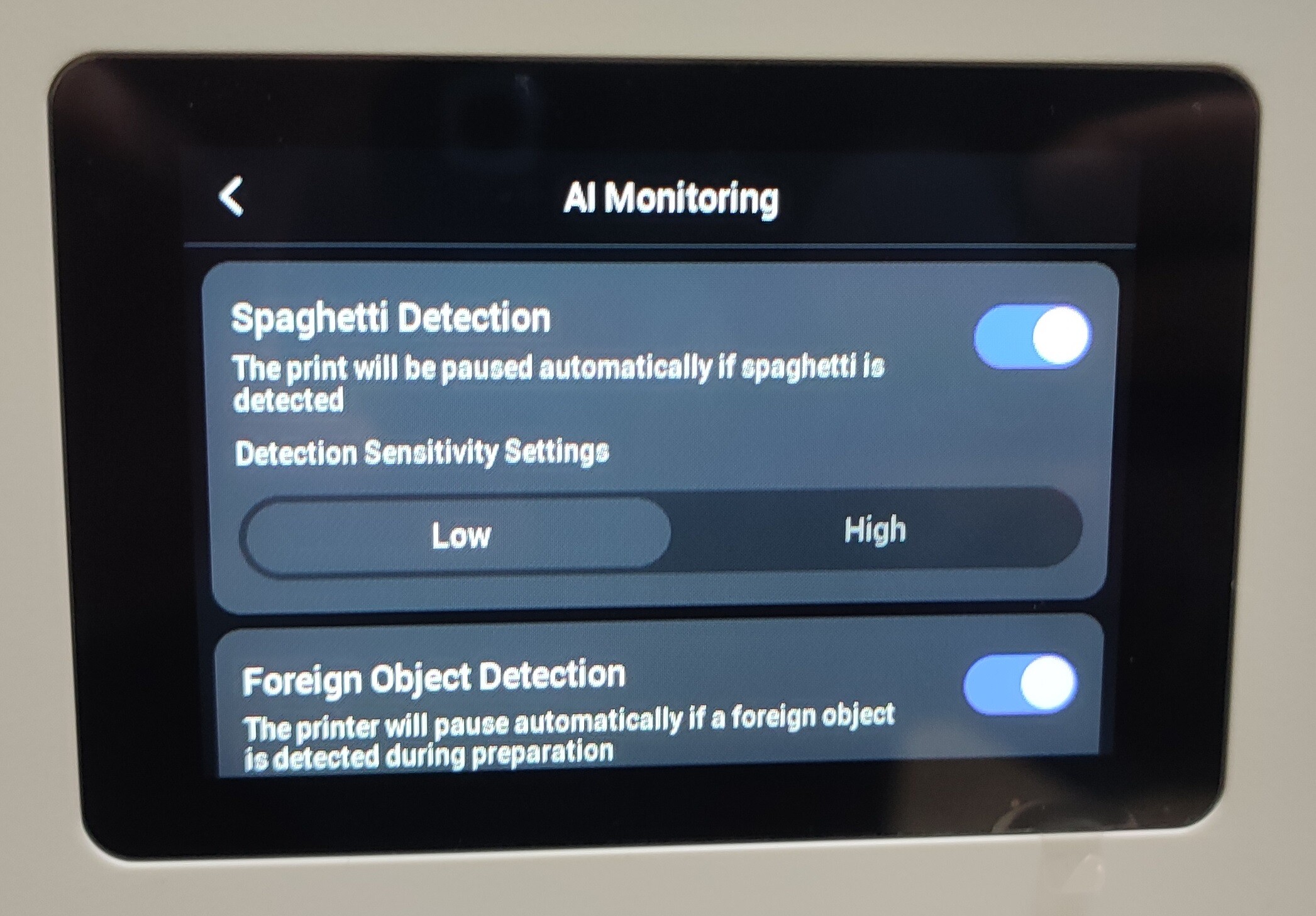 Включение и отключение машинного зрения, настройку чувствительности можно произвести прямо в меню.